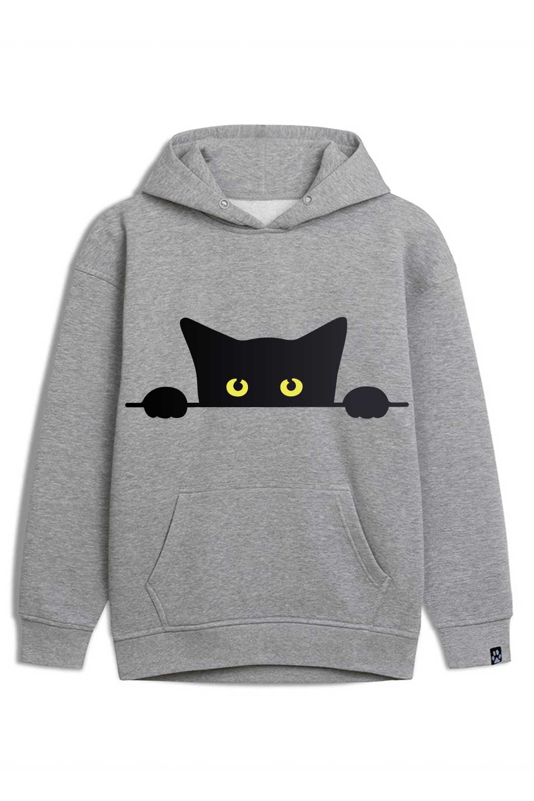 Z klasyczną szarością bluzy estetycznie kontrastują białe dodatki. Z przodu, na środku, widnieje nadruk " koci podglądacz". Natomiast na lewym rękawie jest naszyta metka żakardowa z łapką kota. Te subtelne naszycia stanowią designerską oznakę, że właścicielka bluzy to prawdziwa kociara! Jeśli naprawdę kochasz koty, ta bluza " koci podglądacz" stanowi absolutny must-have Twojej garderoby!