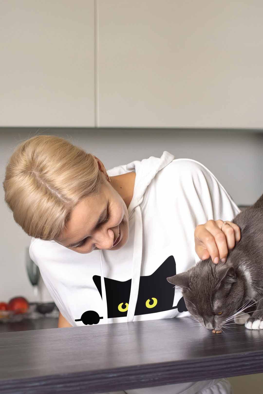 Ta stylowa bluza " koci podglądacz" została starannie uszyta z ciepłej i przyjemnej w dotyku bawełny. Dzięki temu, nosząc ją, będziesz mogła poczuć się prawie tak, jakby otulał Cię Twój własny kotek. Ponadto bluza jest niezwykle komfortowa i funkcjonalna – posiada kaptur, który w razie potrzeby skutecznie ochroni Cię przed wiatrem czy deszczem oraz wygodną kieszeń typu kangur, w której możesz ogrzać zmarznięte dłonie czy schować drobiazgi. Jest idealna zarówno na casualowe spotkania, jak i do uprawiania aktywności fizycznych.