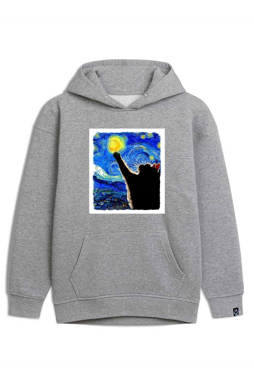 Z klasyczną szarością bluzy estetycznie kontrastują białe dodatki. Z przodu, na środku, widnieje nadruk "kocia gwiaździsta noc". Natomiast na lewym rękawie jest naszyta metka żakardowa z łapką kota. Te subtelne naszycia stanowią designerską oznakę, że właścicielka bluzy to prawdziwa kociara! Jeśli naprawdę kochasz koty, ta bluza "kocia gwiaździsta noc" stanowi absolutny must-have Twojej garderoby!