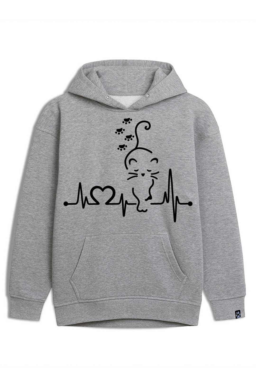 Z klasyczną szarością bluzy estetycznie kontrastują białe dodatki. Z przodu, na środku, widnieje nadruk "kocie EKG". Natomiast na lewym rękawie jest naszyta metka żakardowa z łapką kota. Te subtelne naszycia stanowią designerską oznakę, że właścicielka bluzy to prawdziwa kociara! Jeśli naprawdę kochasz koty, ta bluza "kocie EKG" stanowi absolutny must-have Twojej garderoby!