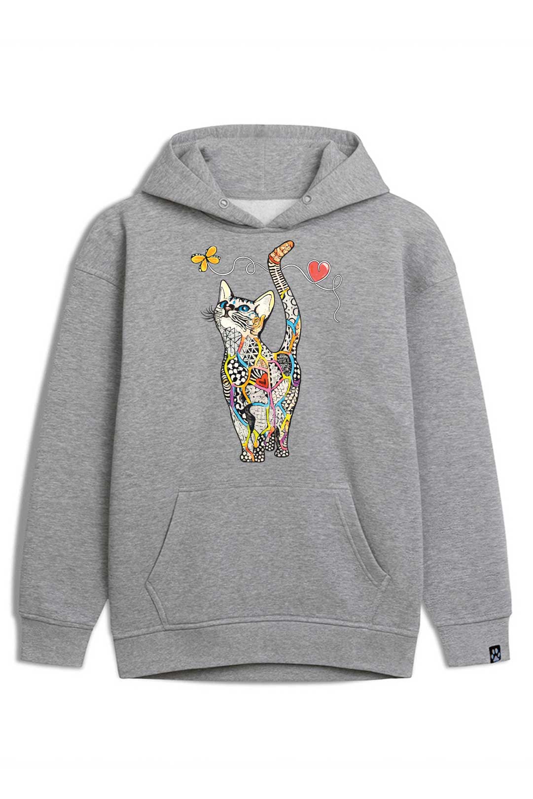 Z klasyczną szarością bluzy estetycznie kontrastują białe dodatki. Z przodu, na środku, widnieje nadruk "kot mozaikowy". Natomiast na lewym rękawie jest naszyta metka żakardowa z łapką kota. Te subtelne naszycia stanowią designerską oznakę, że właścicielka bluzy to prawdziwa kociara! Jeśli naprawdę kochasz koty, ta bluza "kot mozaikowy" stanowi absolutny must-have Twojej garderoby!