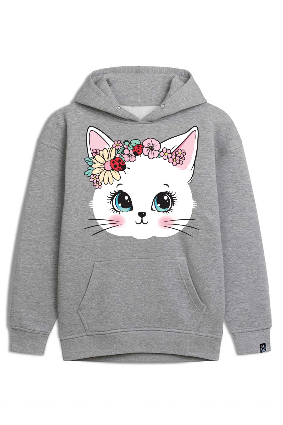 Z klasyczną szarością bluzy estetycznie kontrastują białe dodatki. Z przodu, na środku, widnieje nadruk "kotek w kwiatkach". Natomiast na lewym rękawie jest naszyta metka żakardowa z łapką kota. Te subtelne naszycia stanowią designerską oznakę, że właścicielka bluzy to prawdziwa kociara! Jeśli naprawdę kochasz koty, ta bluza "kotek w kwiatkach" stanowi absolutny must-have Twojej garderoby!