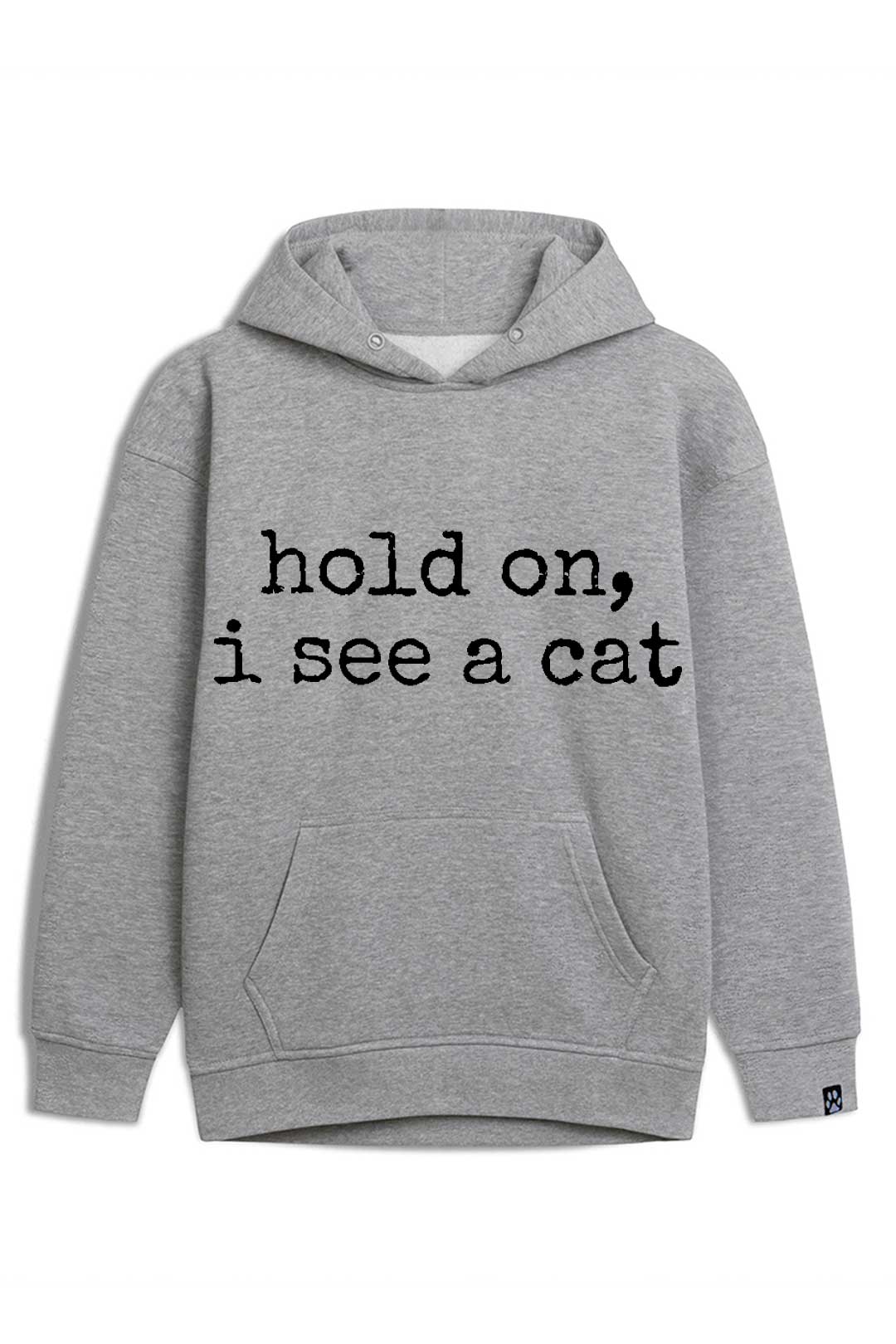 Z klasyczną szarością bluzy estetycznie kontrastują białe dodatki. Z przodu, na środku, widnieje nadruk "poczekaj , widzę kota". Natomiast na lewym rękawie jest naszyta metka żakardowa z łapką kota. Te subtelne naszycia stanowią designerską oznakę, że właścicielka bluzy to prawdziwa kociara! Jeśli naprawdę kochasz koty, ta bluza "poczekaj , widzę kota" stanowi absolutny must-have Twojej garderoby!