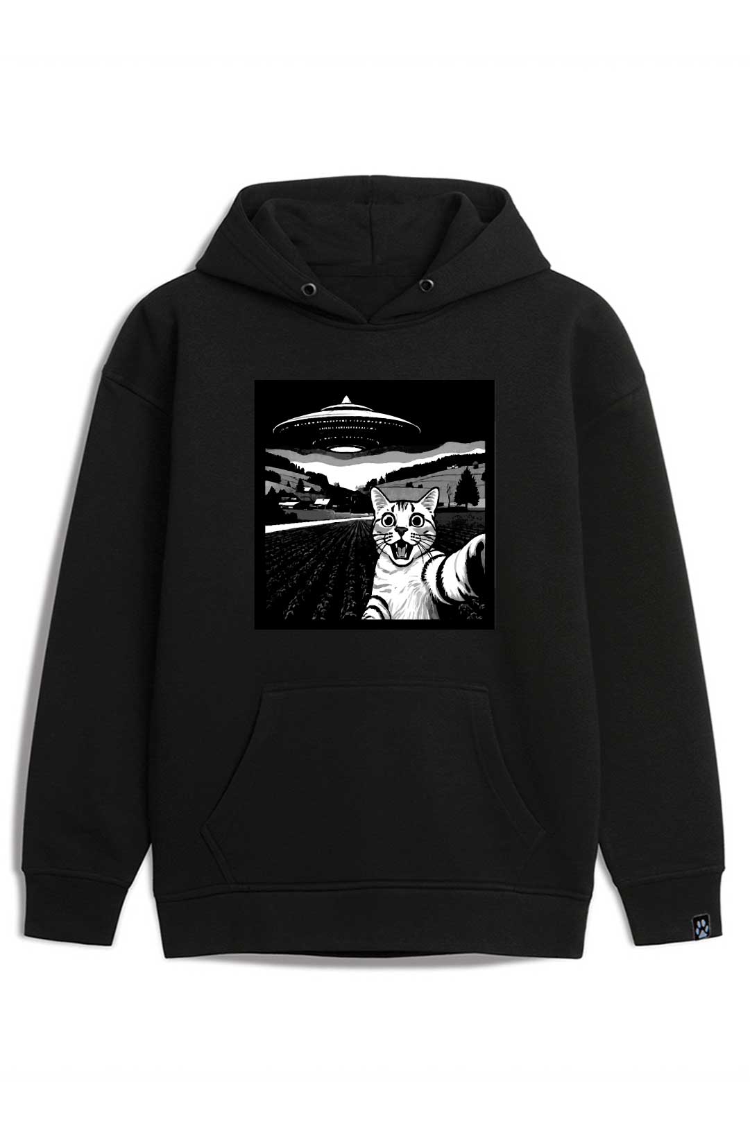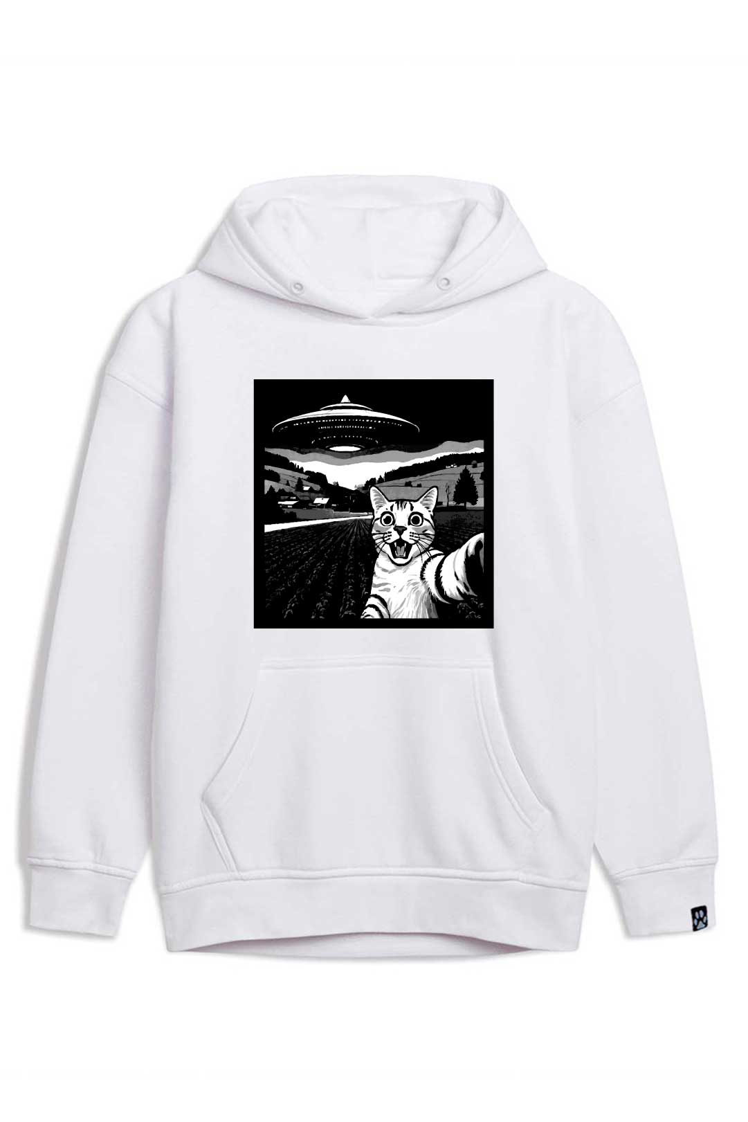 - kolorowy nadruk "selfie z kocim ufo" z przodu, na środku