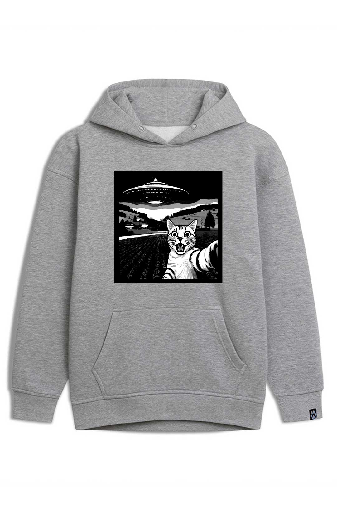 Z klasyczną szarością bluzy estetycznie kontrastują białe dodatki. Z przodu, na środku, widnieje nadruk "selfie z kocim ufo". Natomiast na lewym rękawie jest naszyta metka żakardowa z łapką kota. Te subtelne naszycia stanowią designerską oznakę, że właścicielka bluzy to prawdziwa kociara! Jeśli naprawdę kochasz koty, ta bluza "selfie z kocim ufo" stanowi absolutny must-have Twojej garderoby!