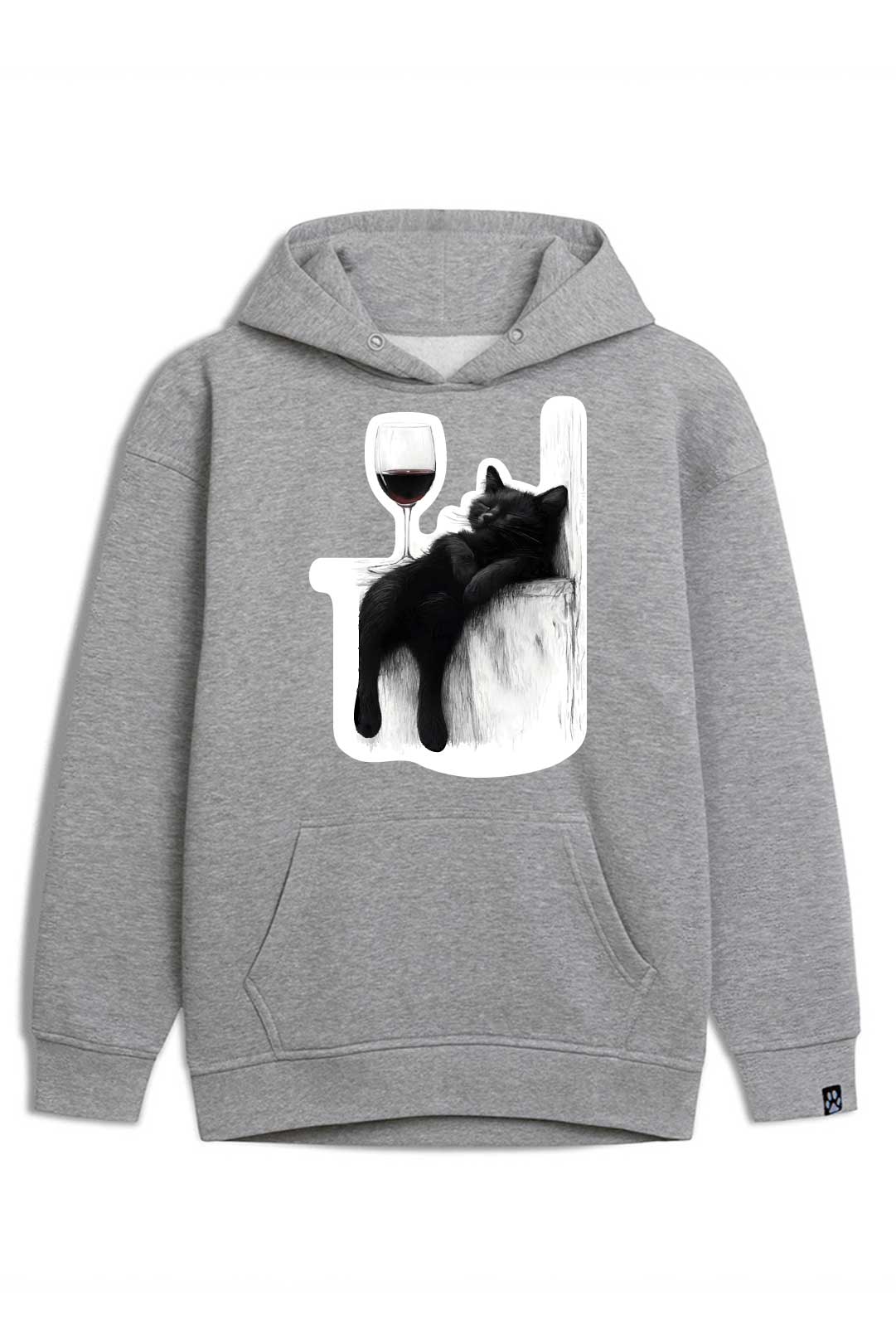 Z klasyczną szarością bluzy estetycznie kontrastują białe dodatki. Z przodu, na środku, widnieje nadruk "śpiący kotek przy winie". Natomiast na lewym rękawie jest naszyta metka żakardowa z łapką kota. Te subtelne naszycia stanowią designerską oznakę, że właścicielka bluzy to prawdziwa kociara! Jeśli naprawdę kochasz koty, ta bluza "śpiący kotek przy winie" stanowi absolutny must-have Twojej garderoby!