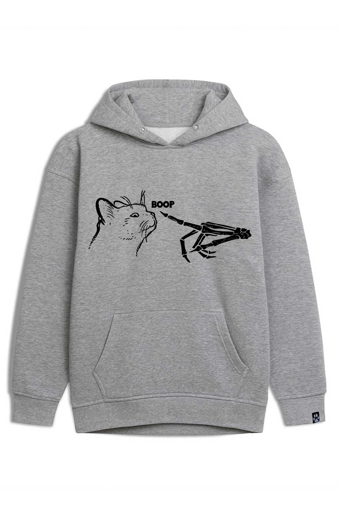 Z klasyczną szarością bluzy estetycznie kontrastują białe dodatki. Z przodu, na środku, widnieje nadruk "szkieletowa kocia miłość". Natomiast na lewym rękawie jest naszyta metka żakardowa z łapką kota. Te subtelne naszycia stanowią designerską oznakę, że właścicielka bluzy to prawdziwa kociara! Jeśli naprawdę kochasz koty, ta bluza "szkieletowa kocia miłość" stanowi absolutny must-have Twojej garderoby!