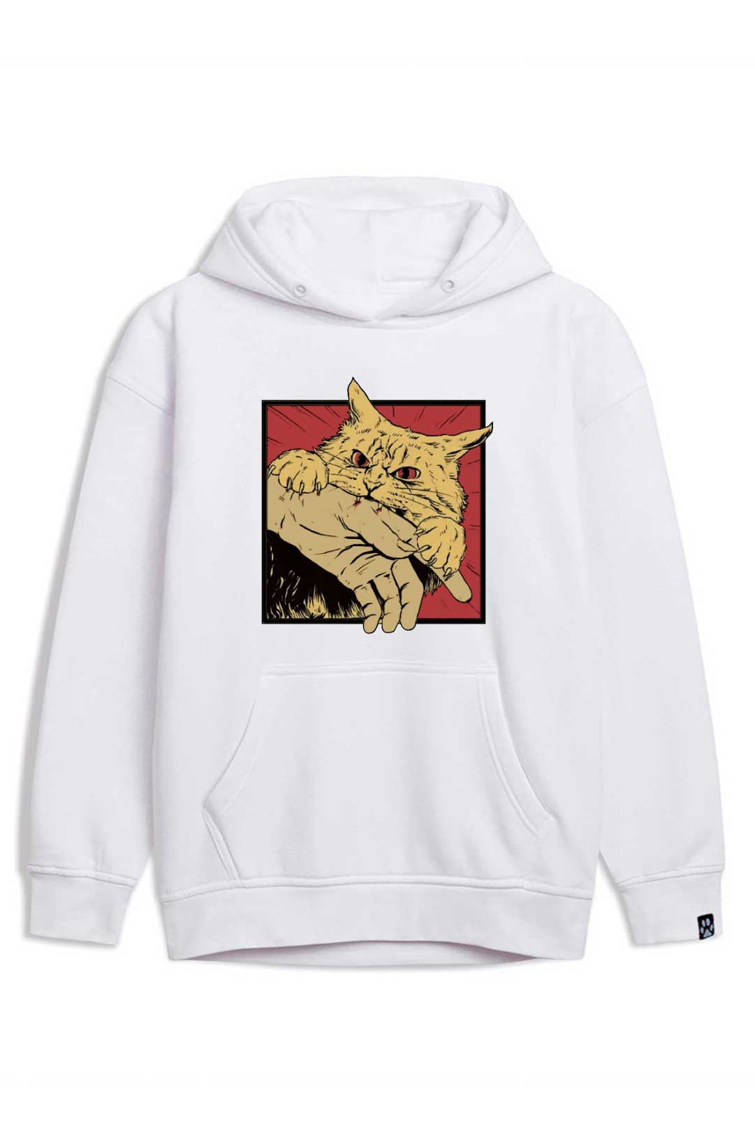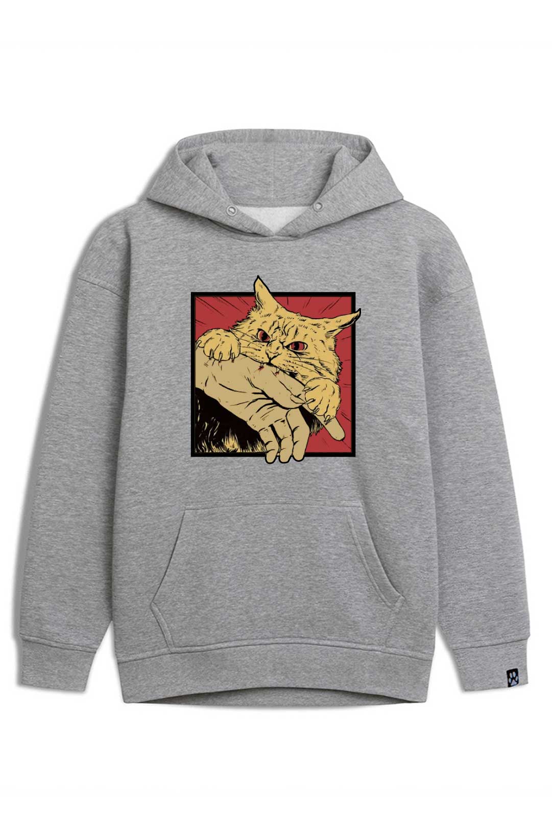 Z klasyczną szarością bluzy estetycznie kontrastują białe dodatki. Z przodu, na środku, widnieje nadruk "zły kocur". Natomiast na lewym rękawie jest naszyta metka żakardowa z łapką kota. Te subtelne naszycia stanowią designerską oznakę, że właścicielka bluzy to prawdziwa kociara! Jeśli naprawdę kochasz koty, ta bluza "zły kocur" stanowi absolutny must-have Twojej garderoby!