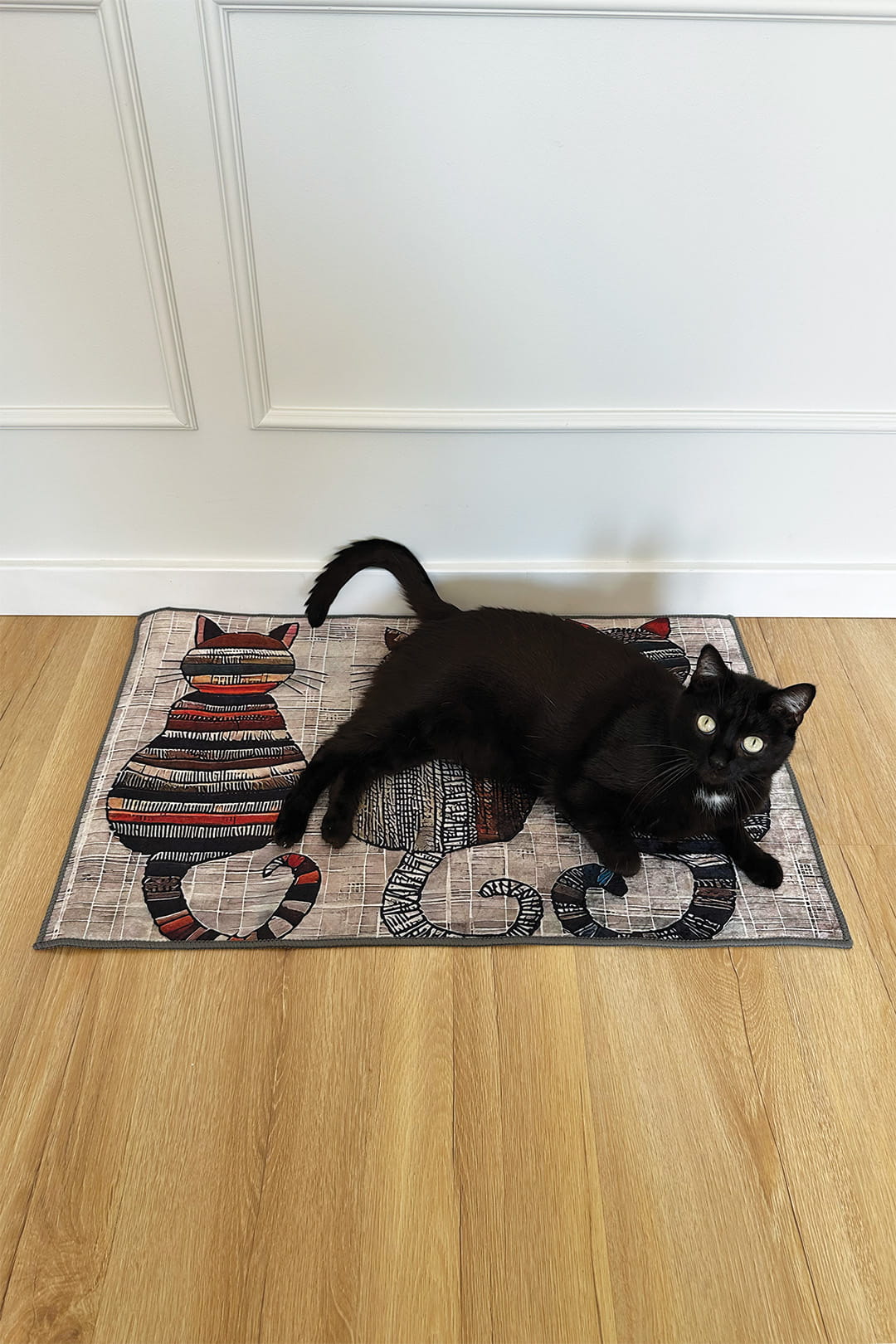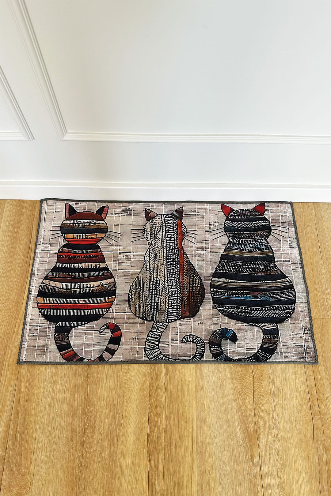 Na dywaniku znajdują się trzy urocze koty w jesiennych odcieniach, które nadają całości ciepła i harmonii. Stonowana, brązowa kolorystyka sprawia, że dywanik świetnie wpisuje się w różne aranżacje wnętrz – od klasycznych po nowoczesne. To także praktyczne rozwiązanie: sierść kota nie odznacza się na tle, co czyni dywanik wyjątkowo przyjaznym w codziennym użytkowaniu.