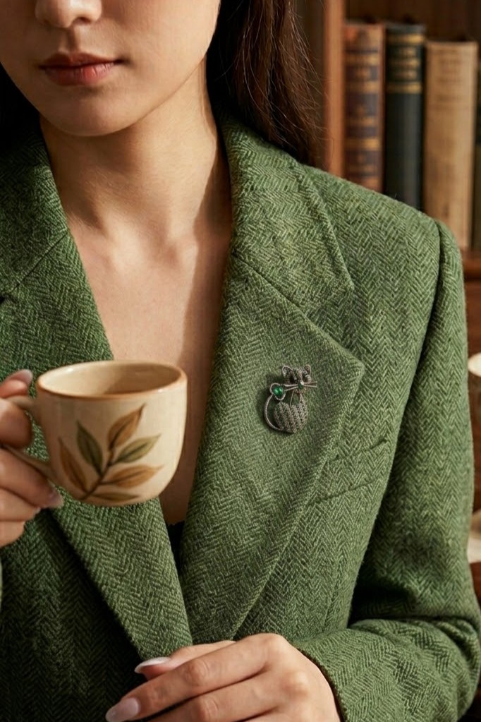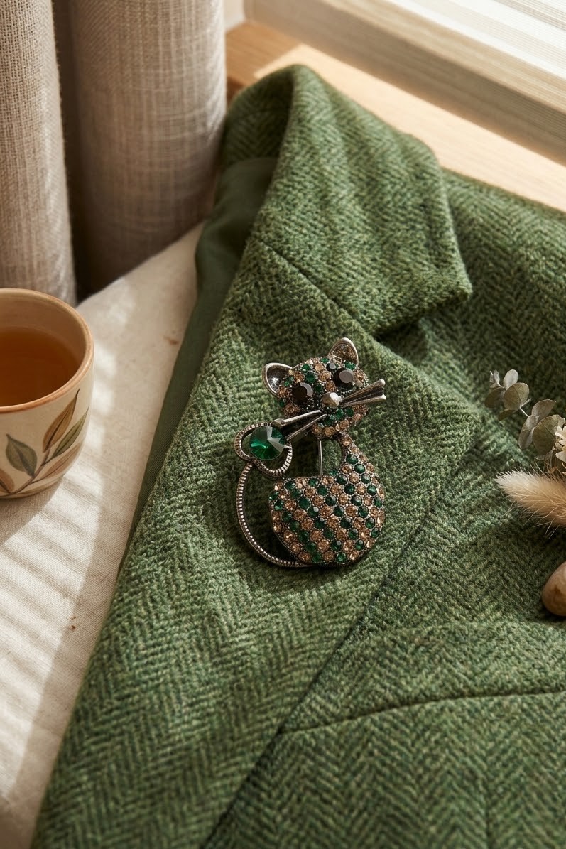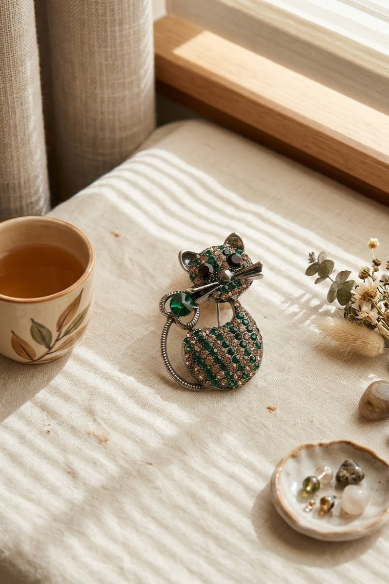 Symbolika: Kot od wieków jest symbolem intuicji, niezależności i domowego ogniska. W połączeniu z zielenią – kolorem nadziei i odrodzenia – ta broszka staje się osobistym talizmanem, który dodaje pewności siebie i spokoju.