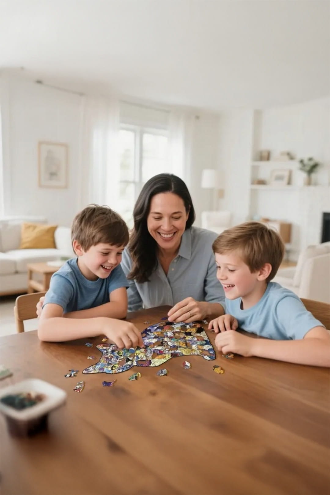 Tutaj nie ma miejsca na nudne, powtarzalne elementy. Puzzle mają nieregularne kształty, a część z nich została zaprojektowana w formie małych kotów, które zaskakują w trakcie układania i dodają całości lekko humorystycznego charakteru. Drewniane wykonanie podkreśla jakość zestawu i sprawia, że układanie jest satysfakcjonujące również pod względem dotyku.