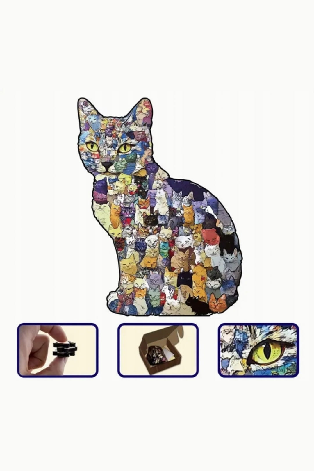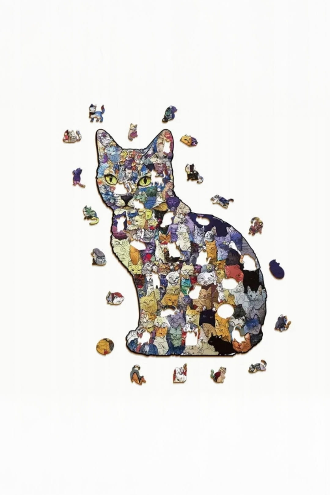 Drewniane puzzle w kształcie kota to układanka, która od samego początku robi po swojemu — dokładnie tak jak kot. Całość po złożeniu tworzy kocią sylwetkę, a wzór na puzzlach również wypełniony jest kocimi motywami, dzięki czemu zestaw jest spójny, charakterystyczny i po prostu przyjemny dla oka.