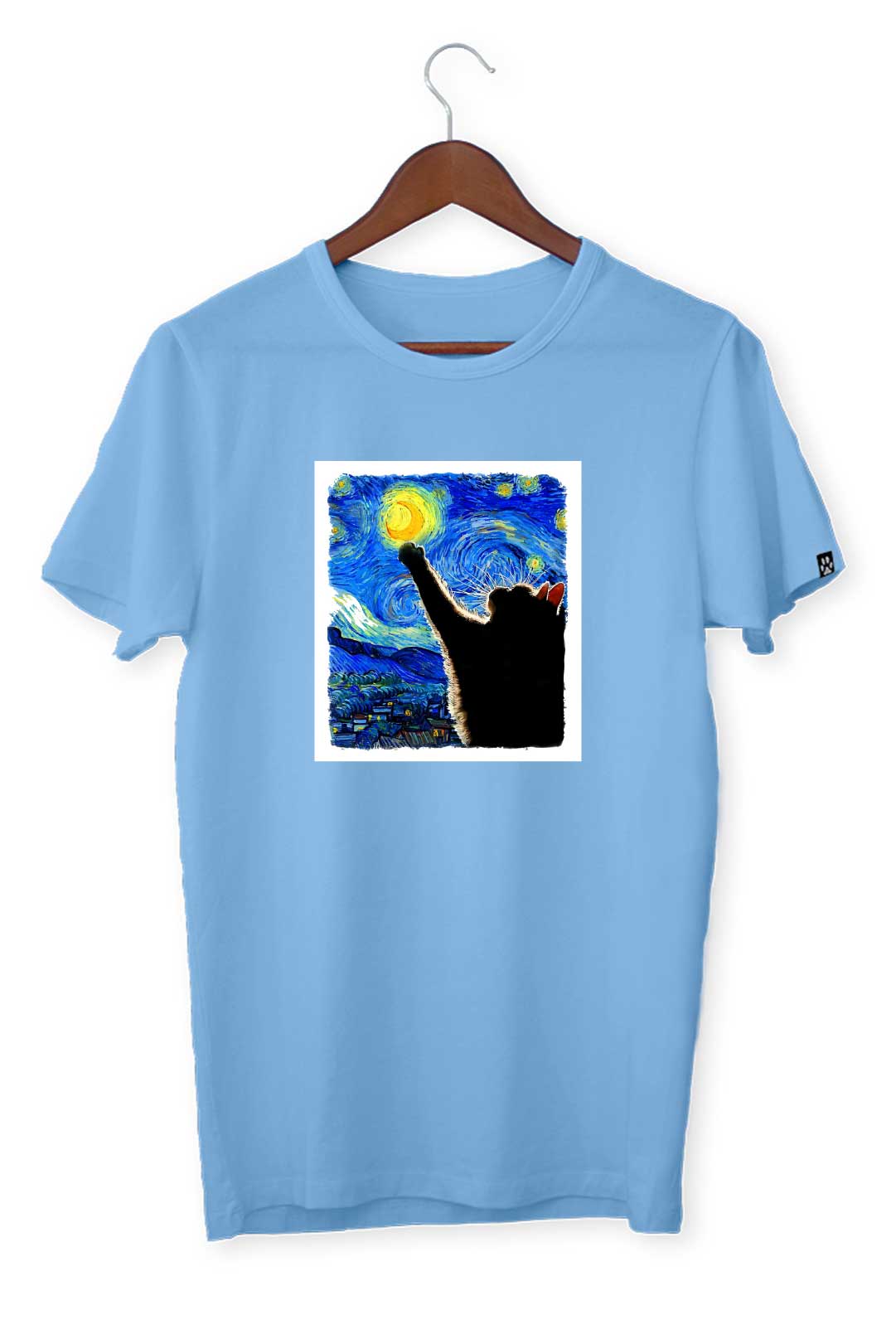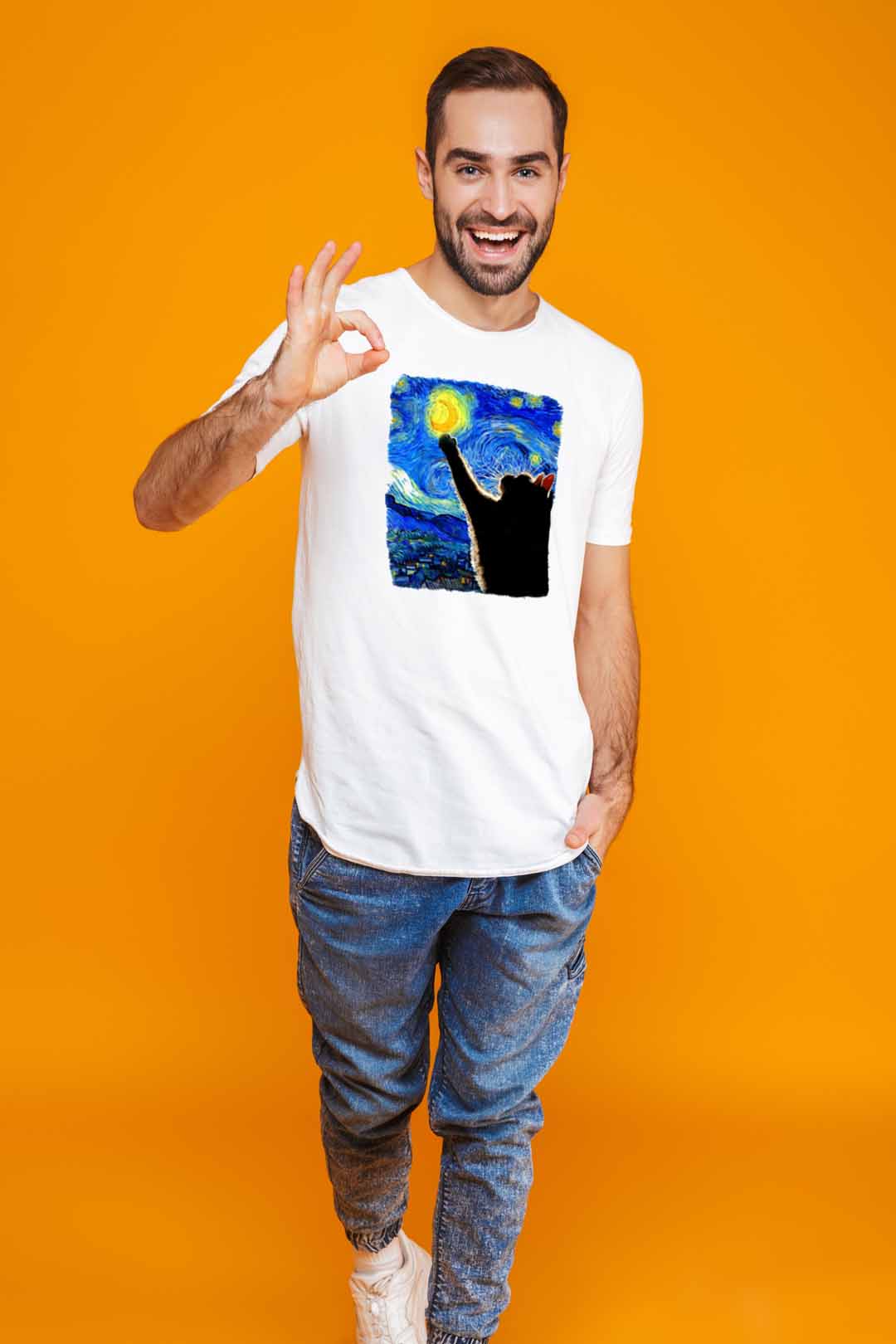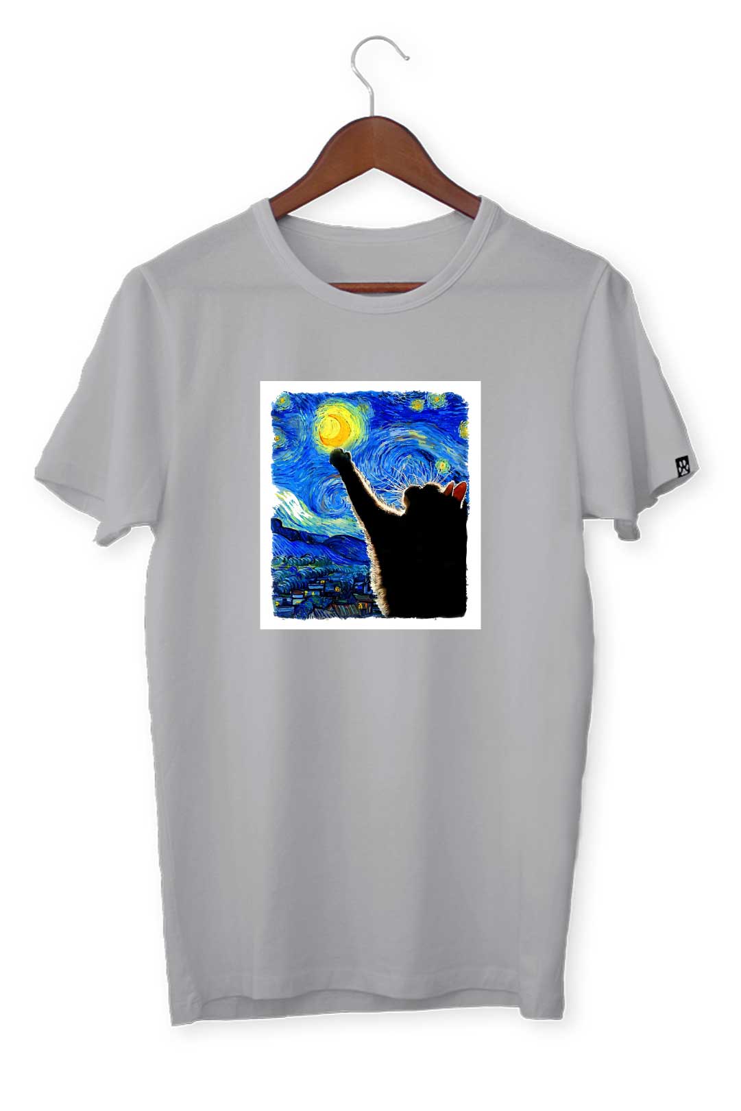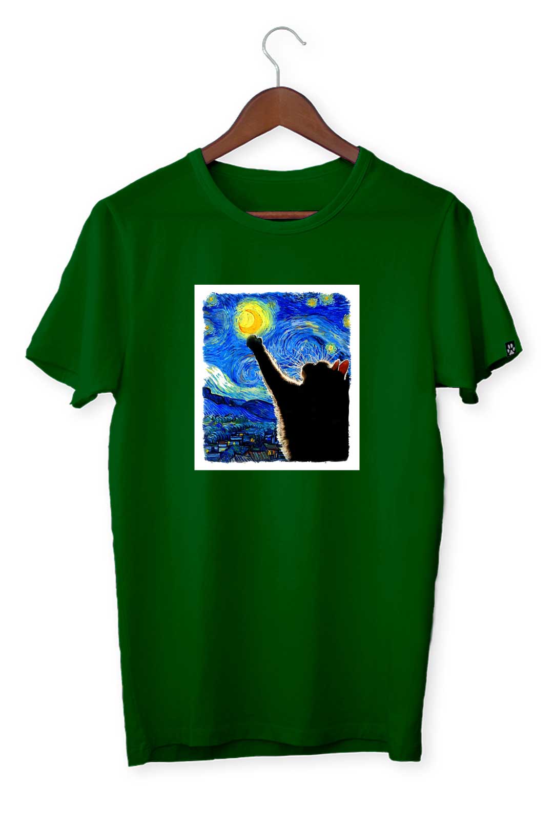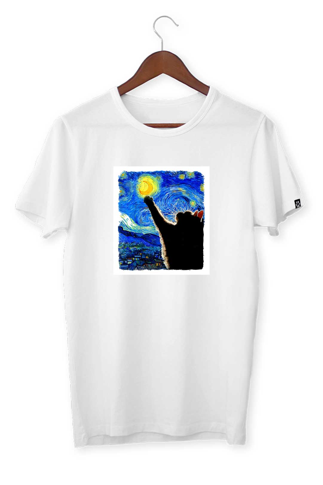 Ten klasyczny T-shirt kocia gwiaździsta noc pasuje do wszystkiego, dlatego spokojnie możesz założyć go do bluzy czy marynarki – w zależności od wybranej stylizacji. Na środku, na tle koszulki, elegancko prezentuje się nadruk kocia gwiaździsta noc. Wraz z metką żakardową z łapką kota na lewym rękawie stanowią wyraziste podkreślenie Twojego zamiłowania do kotów. W tej koszulce będziesz mógł stylowo wygrzewać się na słońcu wraz ze swoim kocim pupilem!