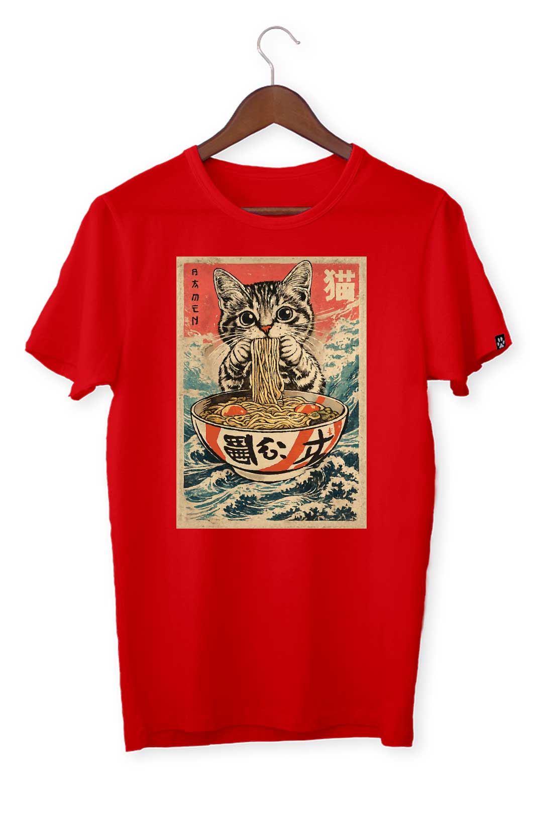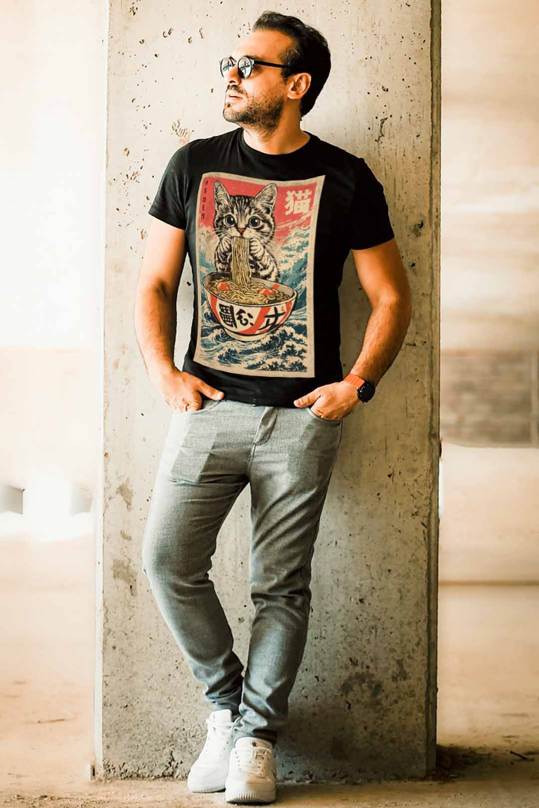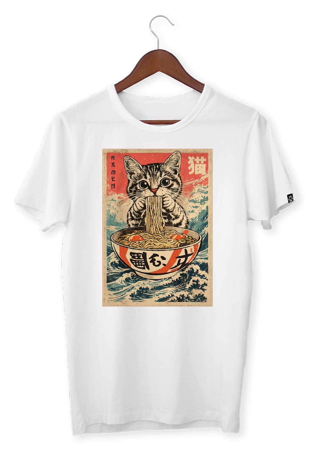 Przewiewna lekka koszulka kot i wielki ramen jest wprost idealna na ciepłe letnie dni! Dzięki wykorzystaniu naturalnych materiałów, czyli 100% bawełny, Twoja skóra będzie mogła swobodnie oddychać, a Ty będziesz mógł poczuć się w 100% komfortowo.