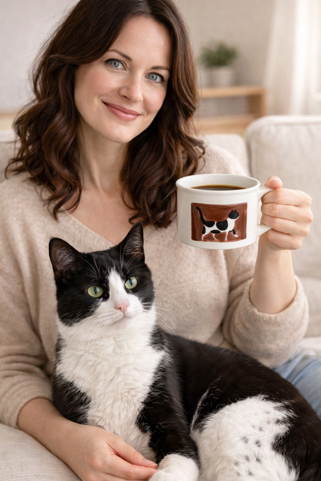 Już przy pierwszym spojrzeniu przyciąga uwagę subtelną formą i uroczą ilustracją kota. Delikatna ceramika w naturalnym, ciepłym odcieniu i ręcznie malowany motyw sprawiają, że wygląda bardziej jak małe dzieło sztuki niż zwykły kubek.