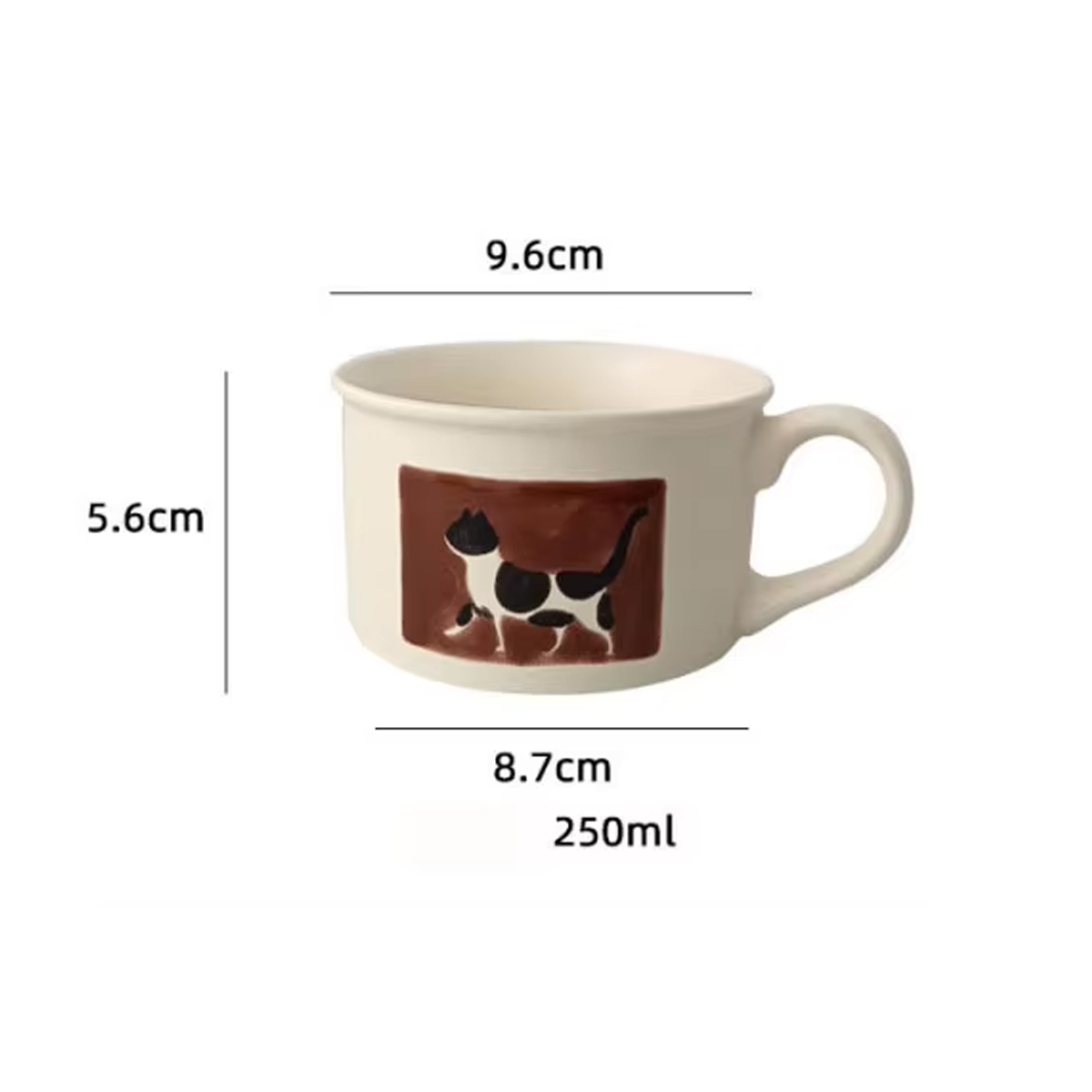 Centralnym punktem kubka jest ręcznie malowany kot – spokojny, elegancki, trochę tajemniczy. Motyw został umieszczony na ciepłym, brązowym tle, które pięknie kontrastuje z jasną ceramiką.