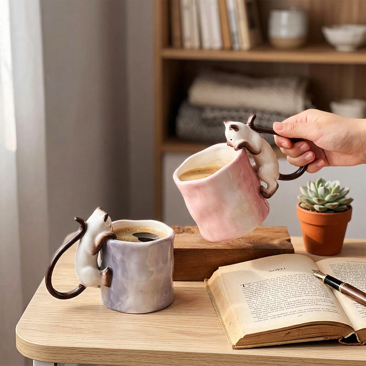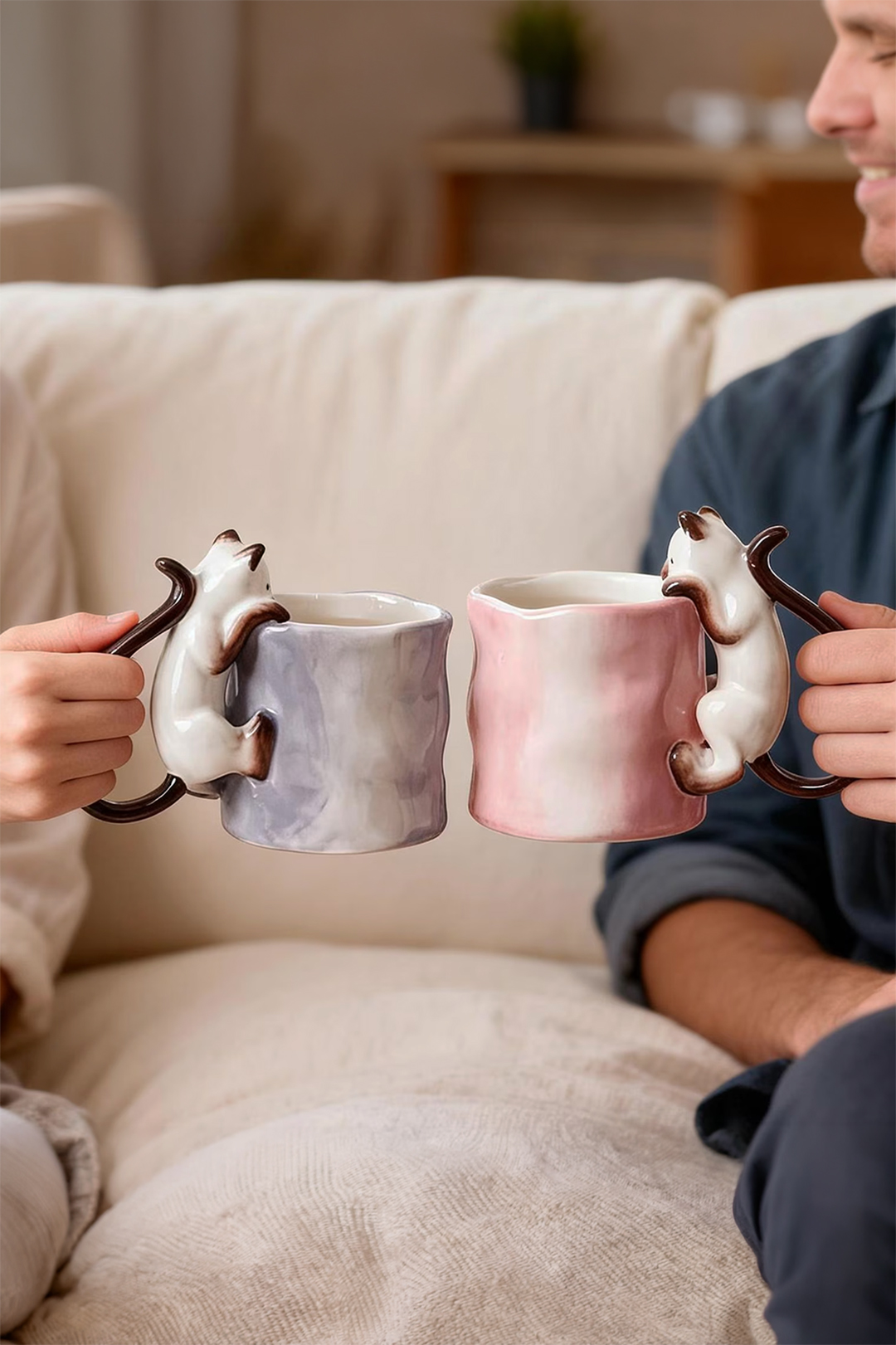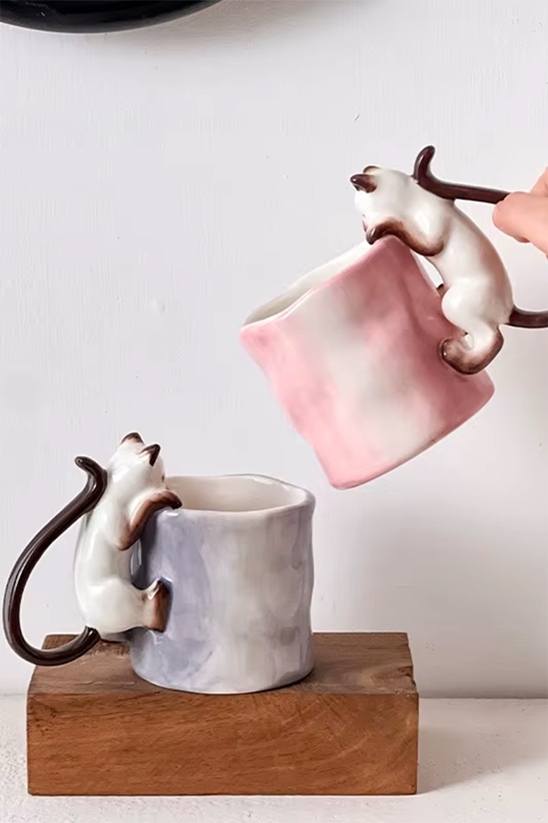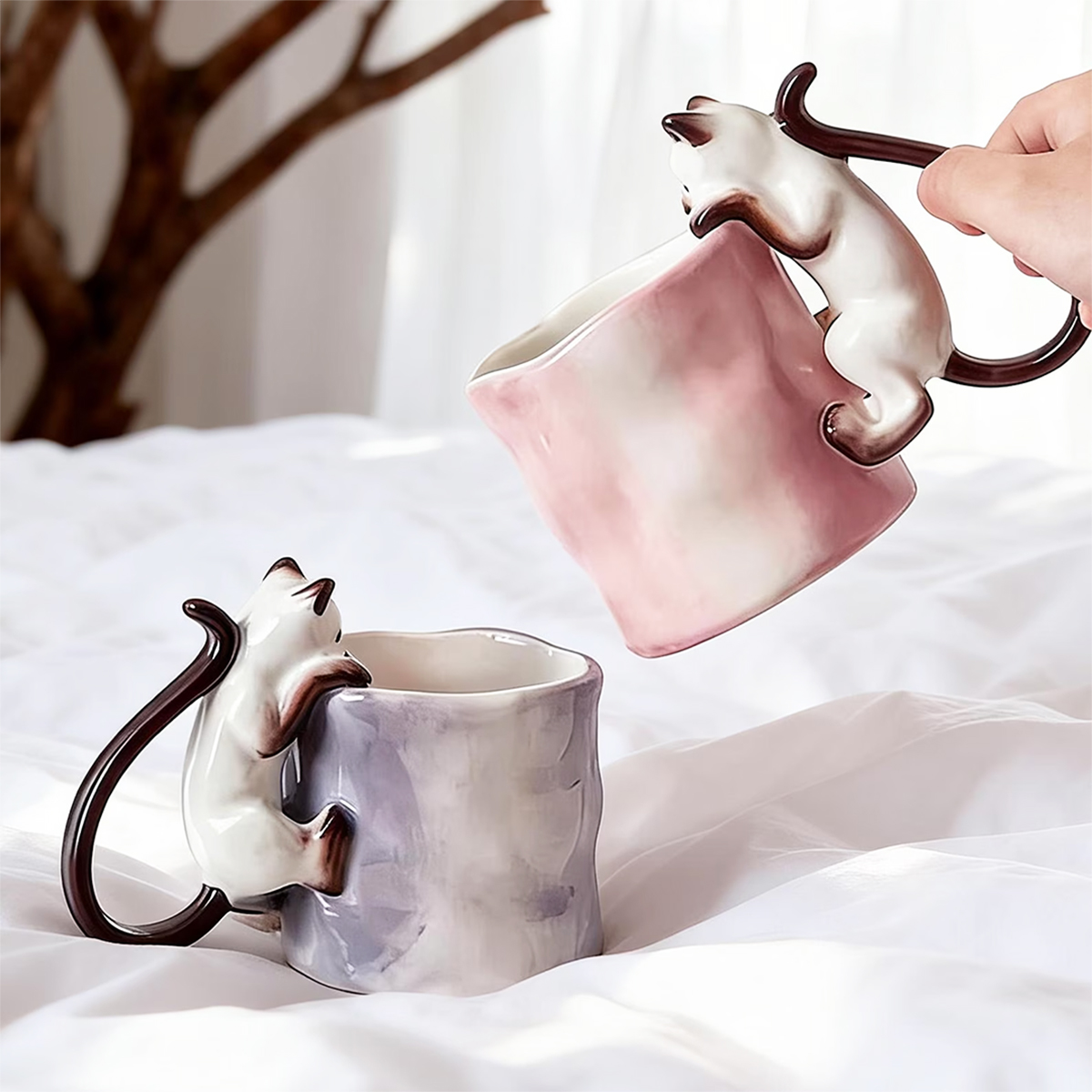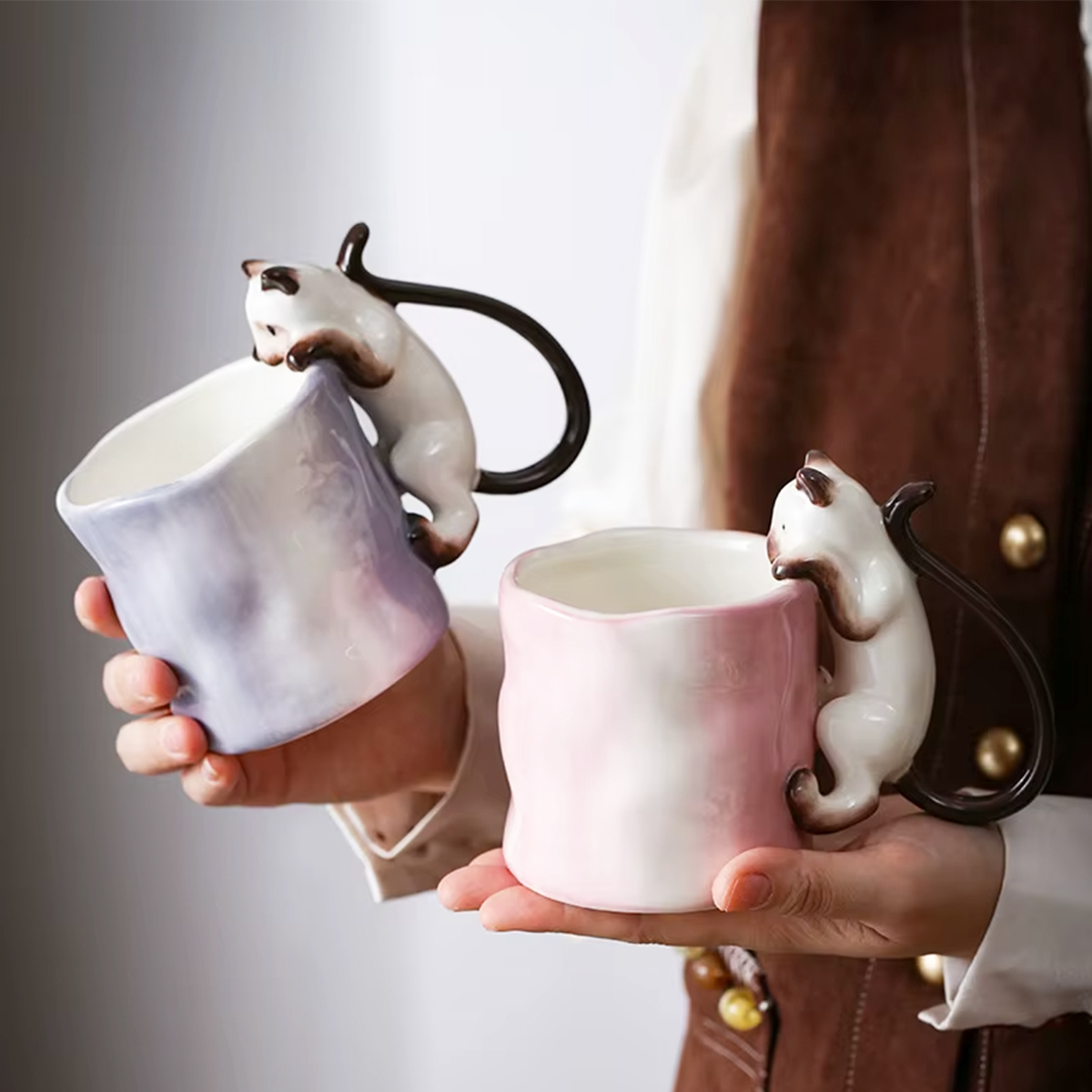 Już przy pierwszym spojrzeniu widać, że to coś więcej niż zwykły kubek na kawę. Delikatna ceramika, subtelna faktura i uroczy kot wspinający się po kubku tworzą wyjątkowy przedmiot, który przyciąga wzrok i wywołuje uśmiech – za każdym razem, gdy po niego sięgasz.
