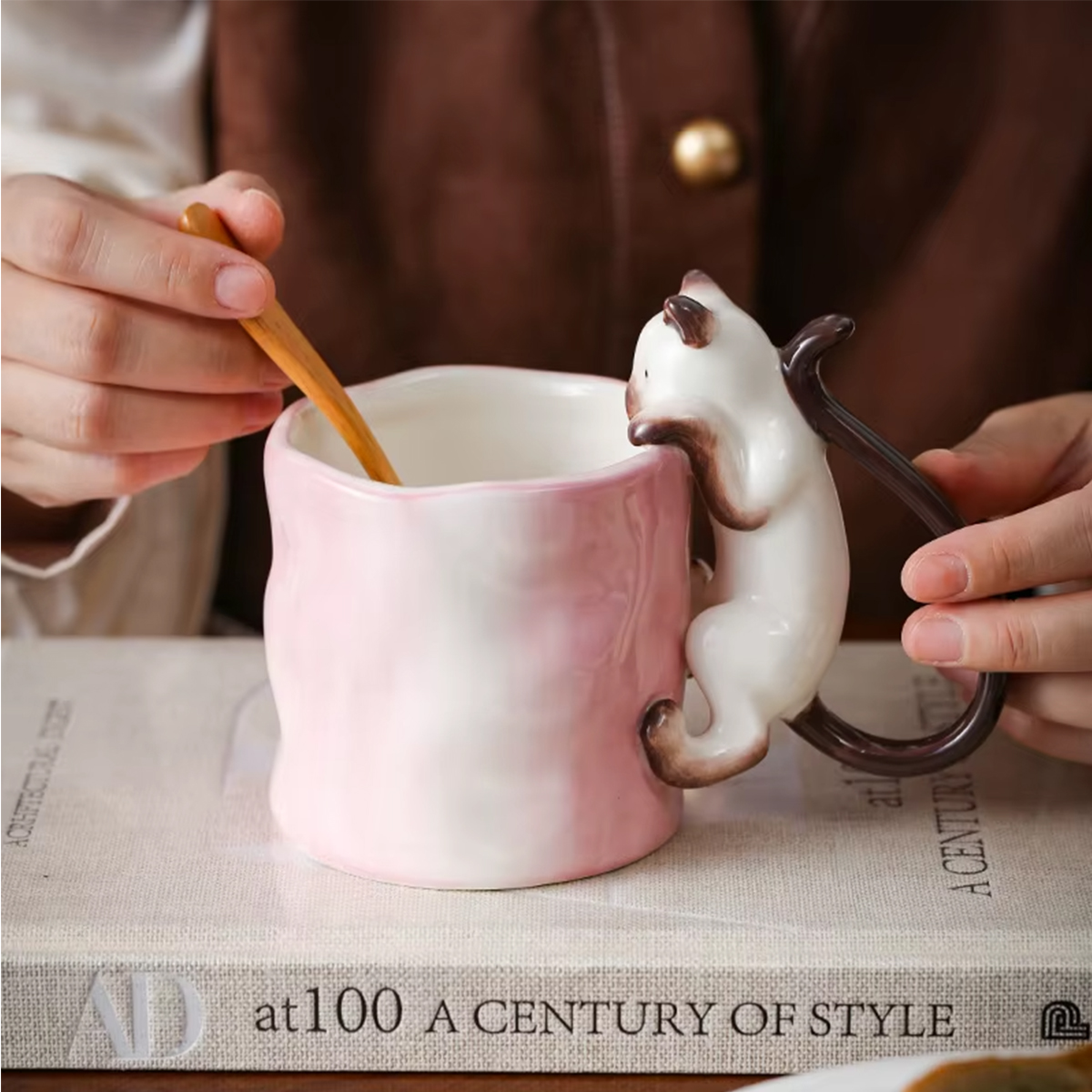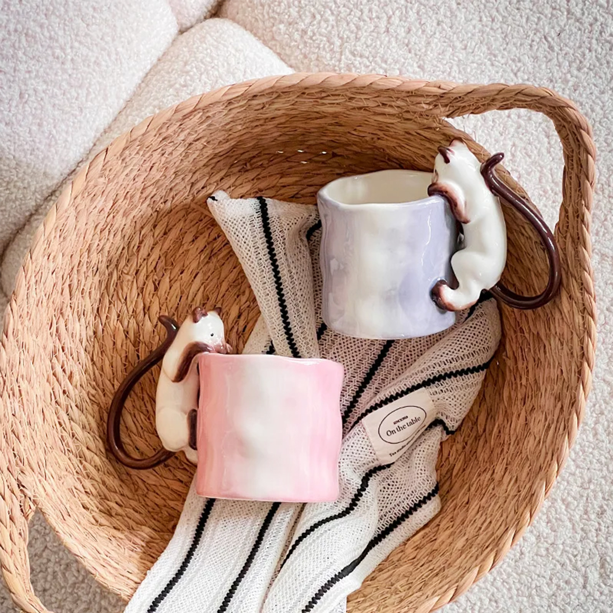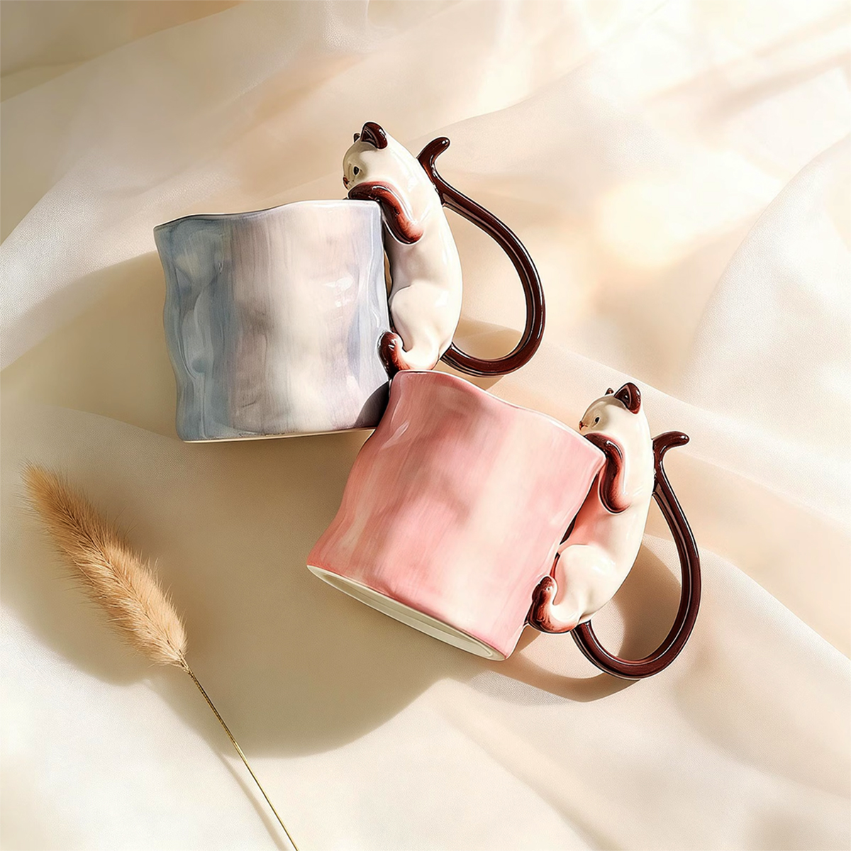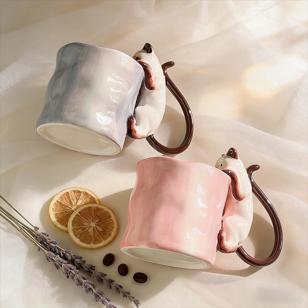 Już przy pierwszym spojrzeniu widać, że to coś więcej niż zwykły kubek na kawę. Delikatna ceramika, subtelna faktura i uroczy kot wspinający się po kubku tworzą wyjątkowy przedmiot, który przyciąga wzrok i wywołuje uśmiech – za każdym razem, gdy po niego sięgasz.