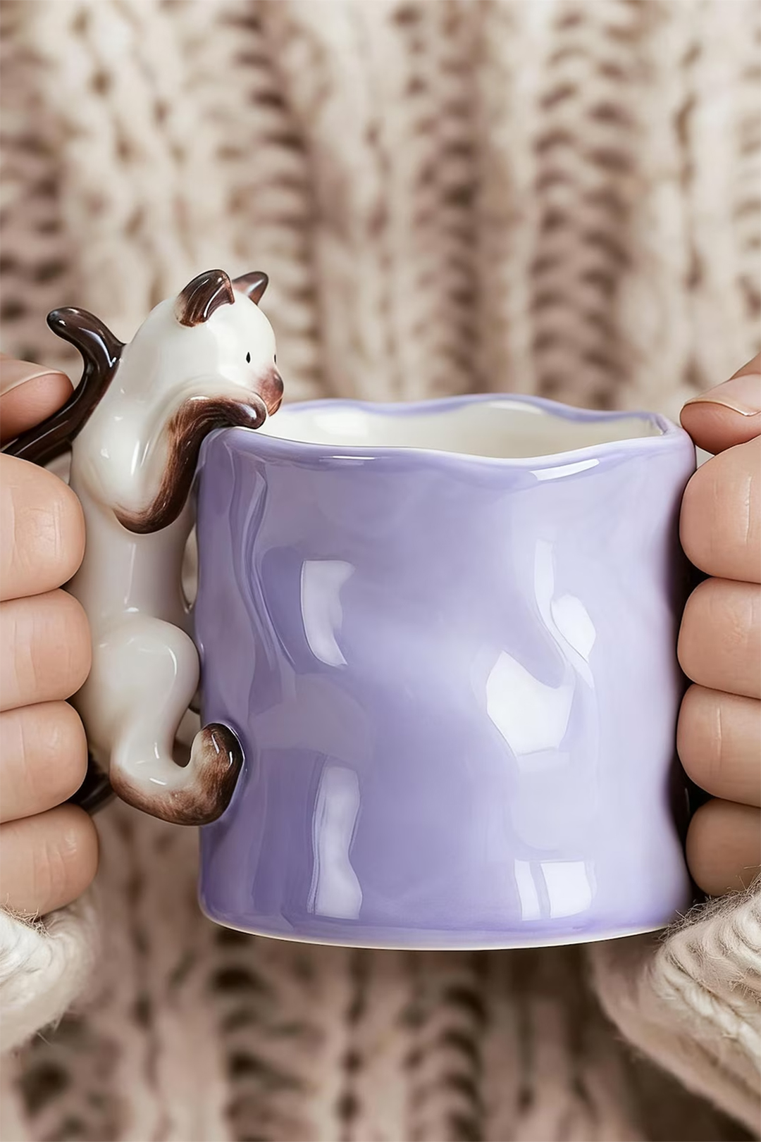 Uchwyt w formie ogona kota i figurka wspinającego się kotka sprawiają, że kubek wygląda jak miniaturowa rzeźba. Jest przyjemny w dotyku, stabilny i idealnie wyważony.