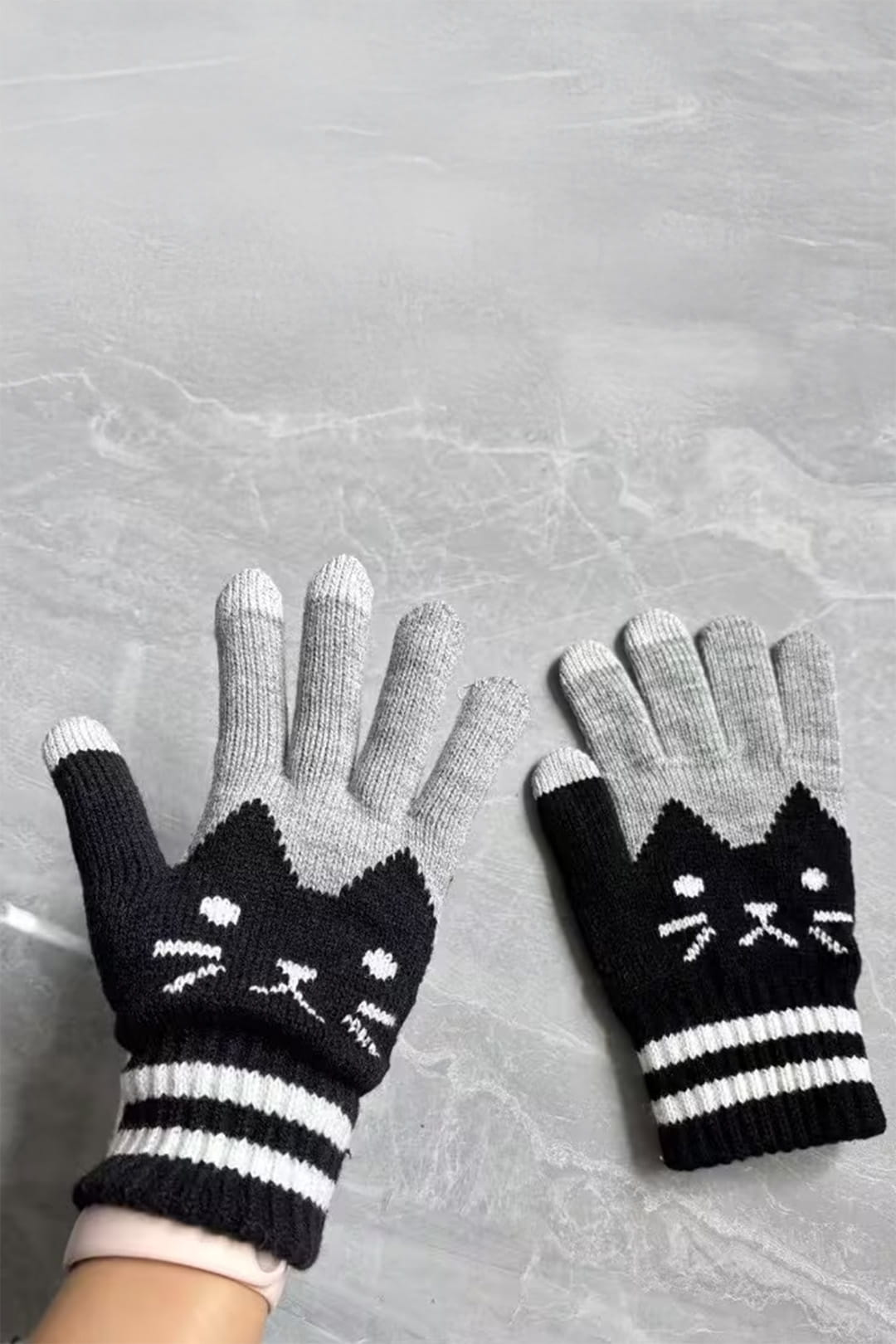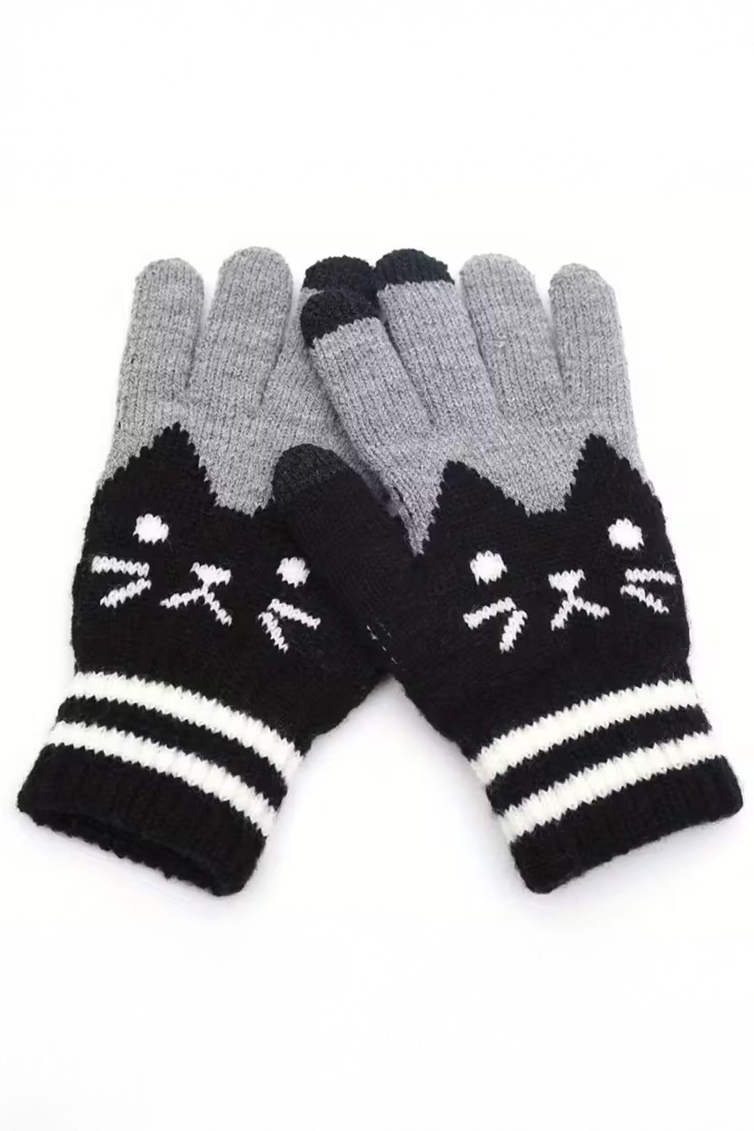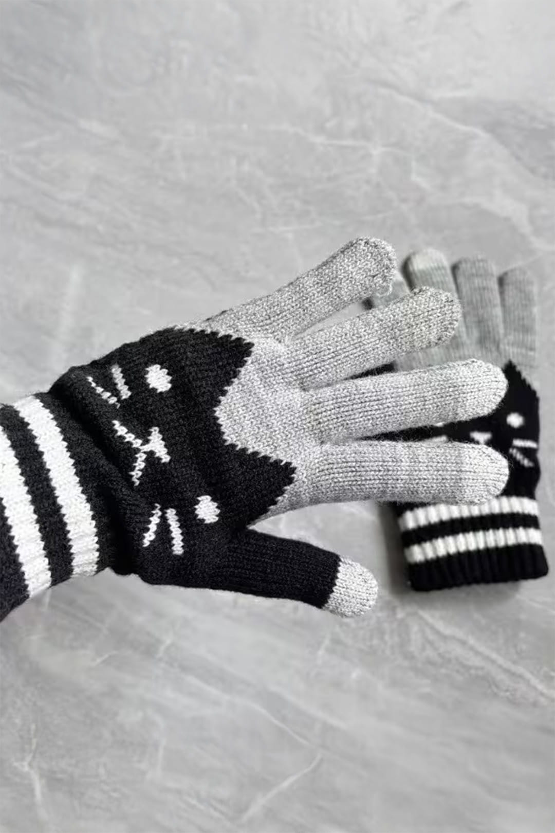 Rękawiczki do smartfona z motywem kota to połączenie funkcjonalności i subtelnego designu inspirowanego kocim motywem. Szara kolorystyka stanowi neutralne tło dla graficznego akcentu w postaci czarnej głowy kota, dzięki czemu produkt zachowuje estetyczny, a jednocześnie wyrazisty charakter.