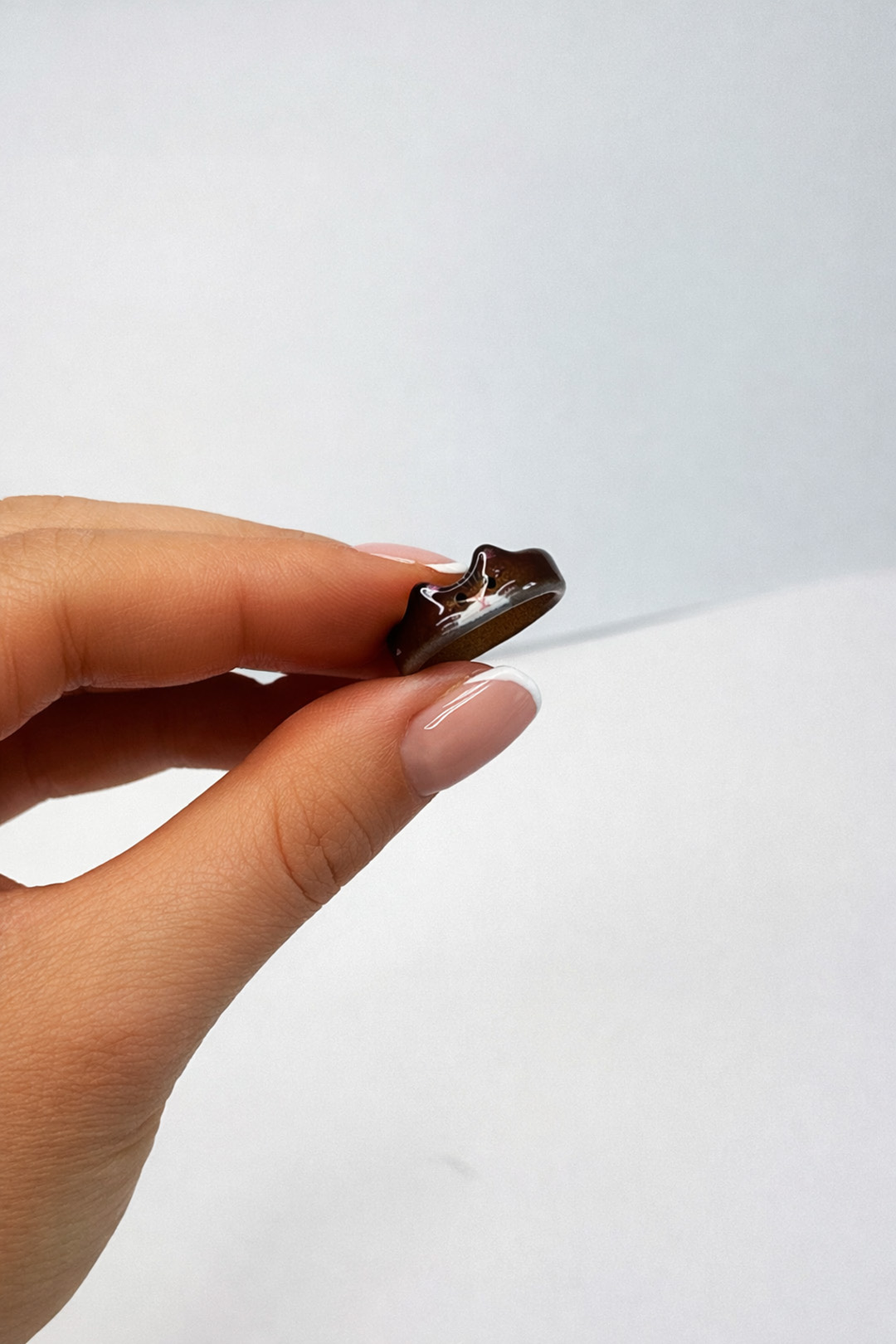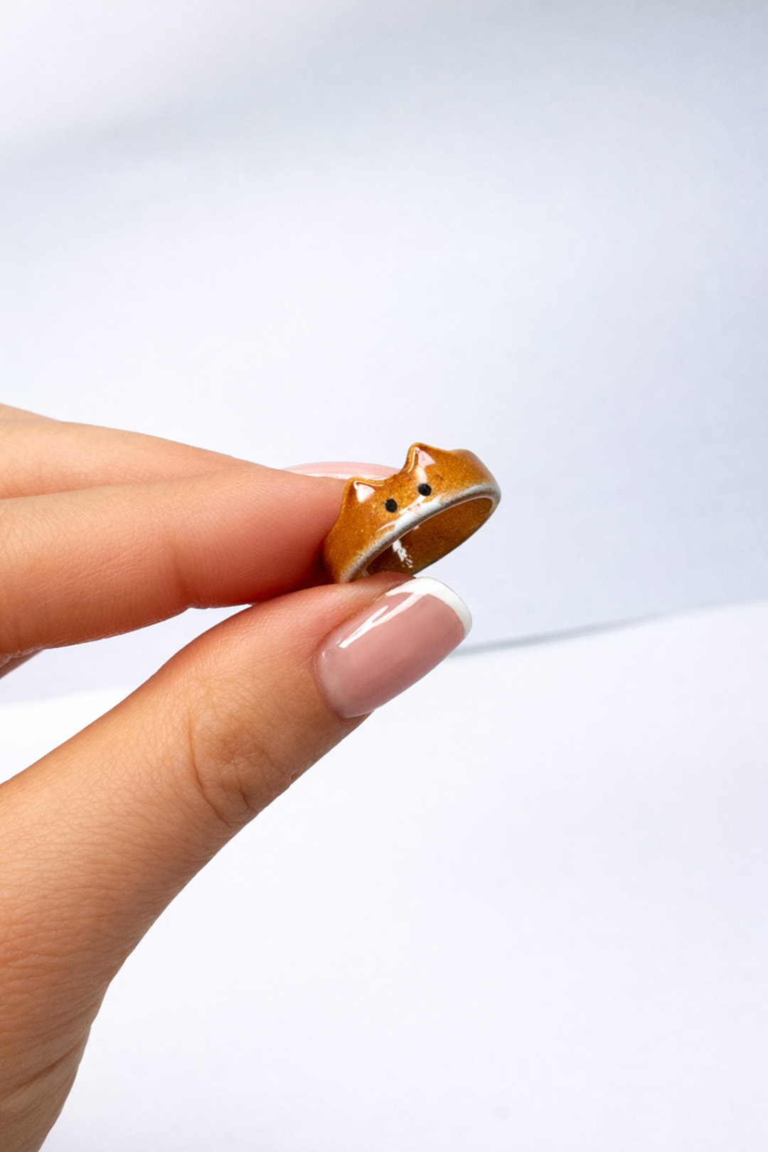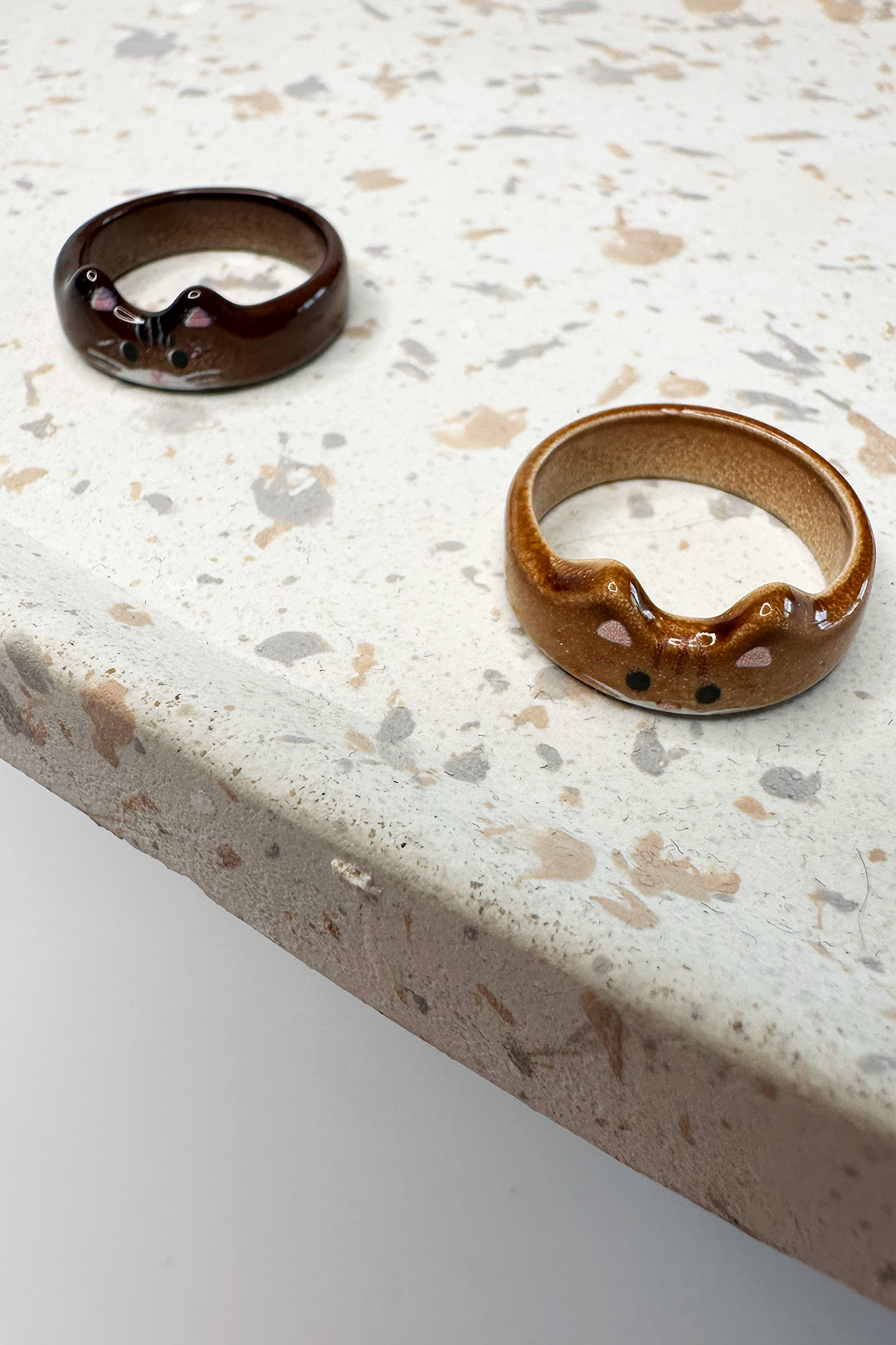 Pierścionek dostępny jest w dwóch wersjach kolorystycznych — ciemno brązowej oraz rudej, czyli dokładnie takich, jakie najczęściej spotkasz na parapecie, kanapie… i klawiaturze. Ma uniwersalny rozmiar - wewnętrzny obwód ok. 5,5 cm.
