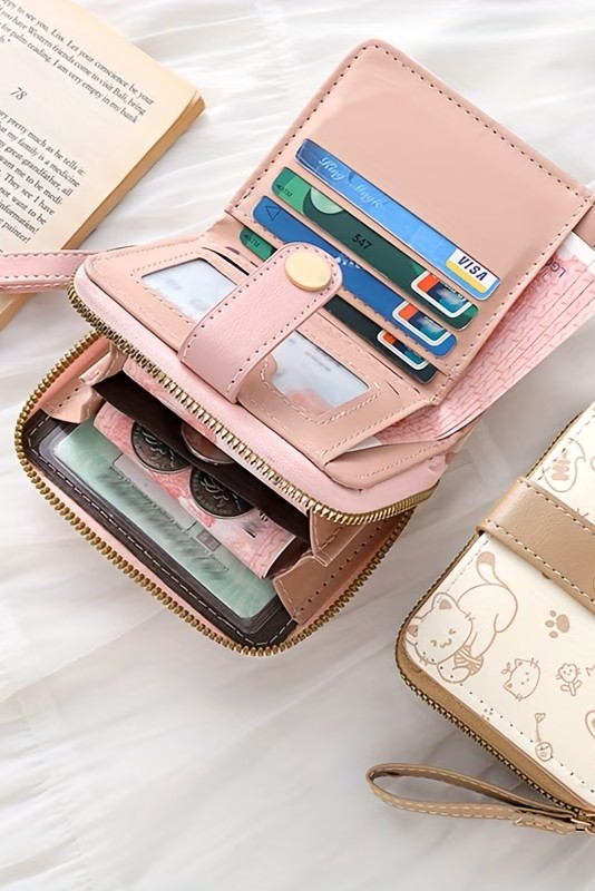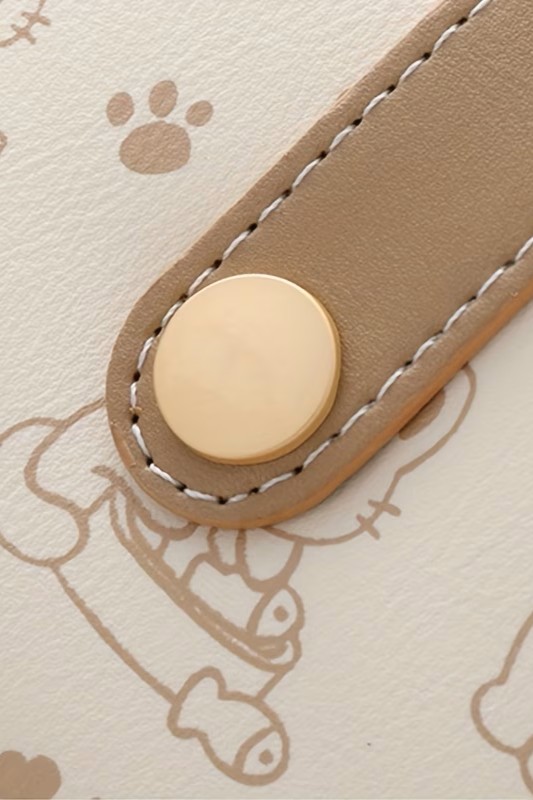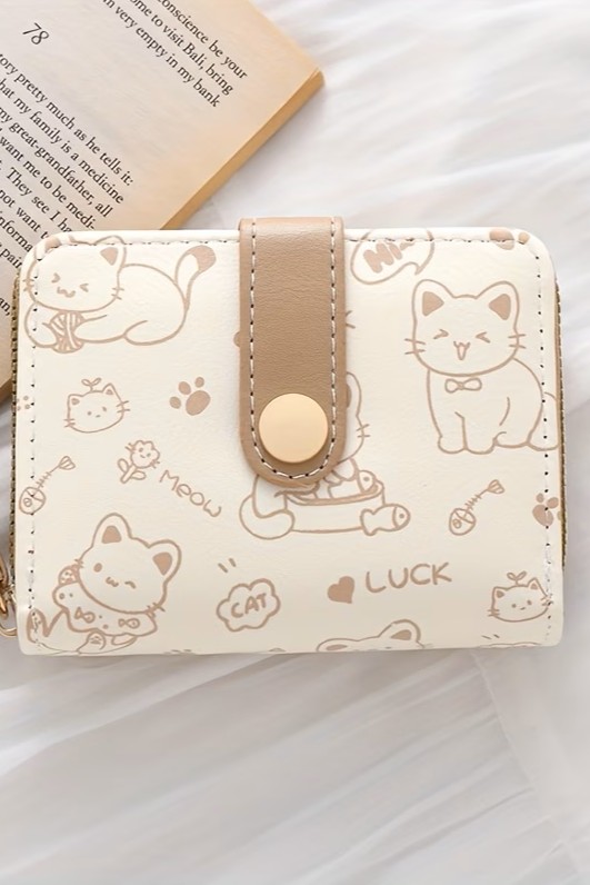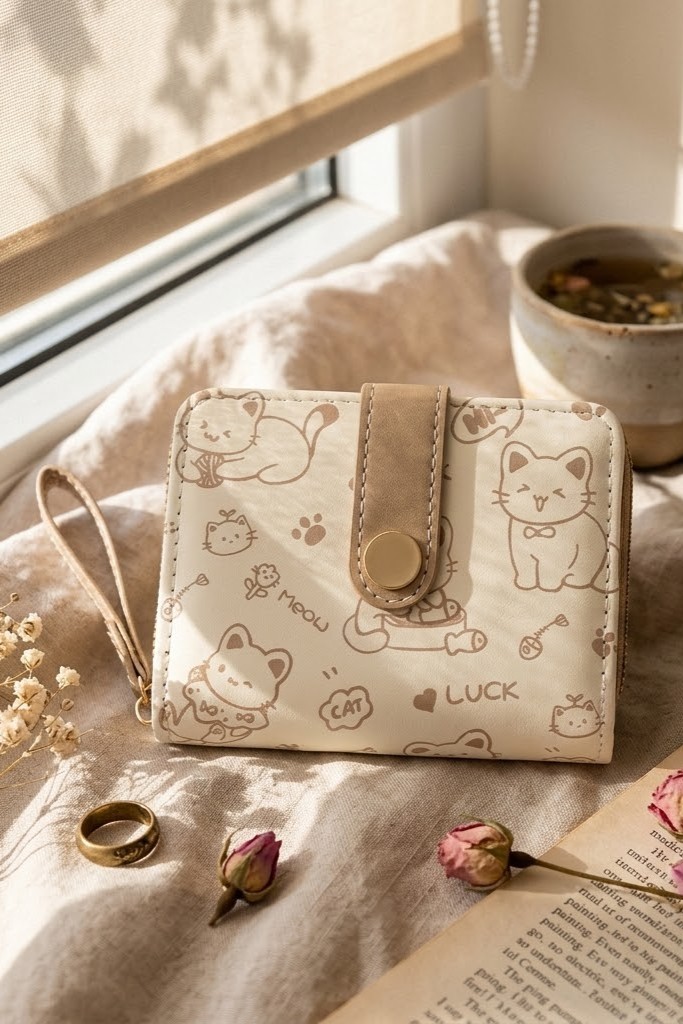 Ten wyjątkowy portfel to połączenie funkcjonalności z estetyką. Wykonany z miękkiej ekoskóry w odcieniu ciepłego beżu i kremowej bieli, ozdobiony jest subtelnymi ilustracjami kotów, które poprawią Ci humor za każdym razem, gdy po niego sięgniesz.