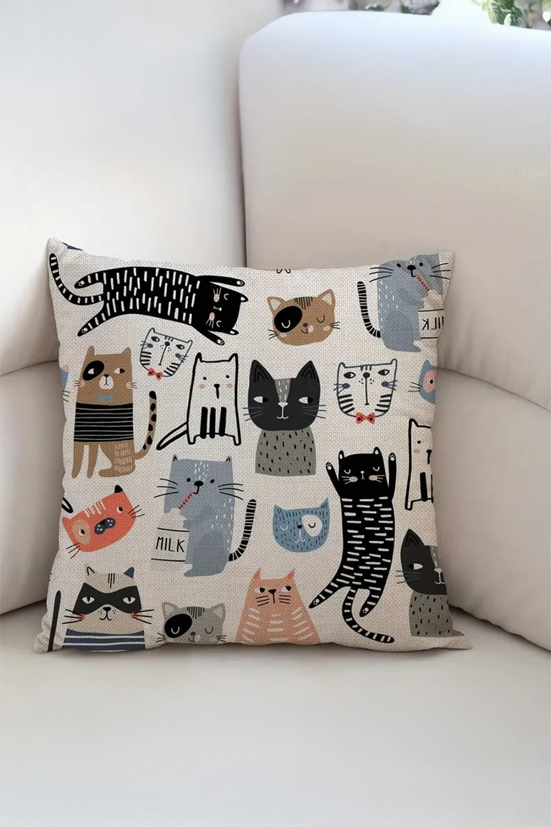 Produkt został wykonany z poliestru, co zapewnia trwałość, odporność na codzienne użytkowanie oraz łatwość pielęgnacji. Poszewka dobrze sprawdzi się jako element dekoracyjny na poduszkach przeznaczonych na kanapę, fotel lub łóżko, szczególnie w domu miłośniczki kotów.