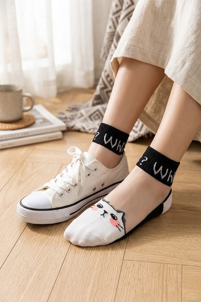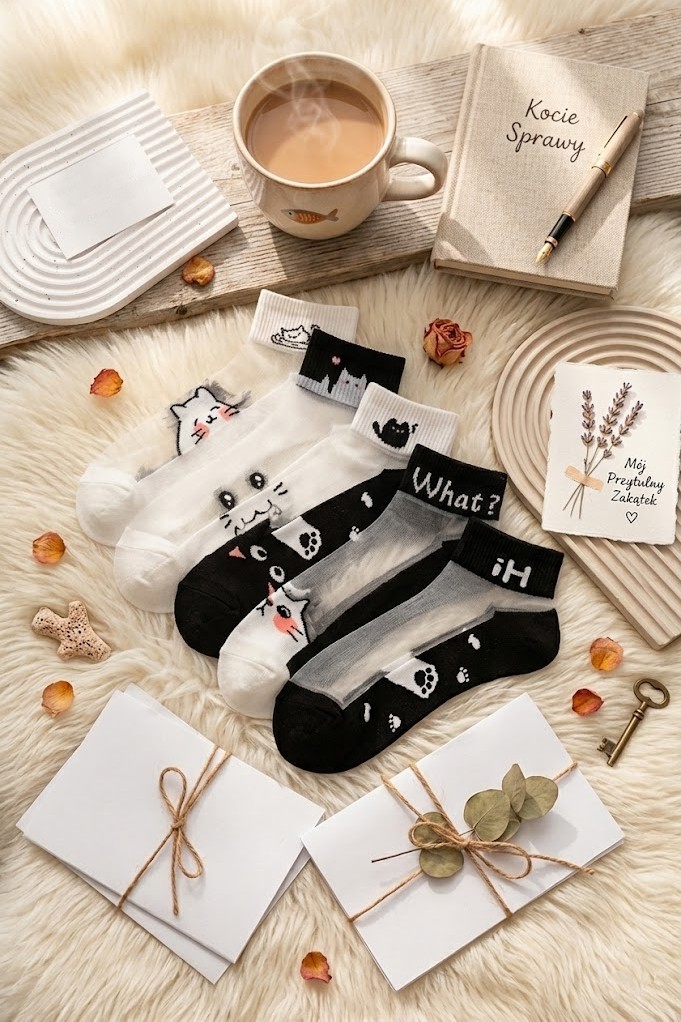 Skarpetki przezroczyste z kotkiem to absolutna gratka dla miłośników kotów i stylowego, wygodnego obuwia. Te urocze skarpetki nie tylko utrzymają Twoje stopy ciepłe i komfortowe, ale także dodadzą Twojemu codziennemu ubraniu nutkę uroku i wyjątkowości.