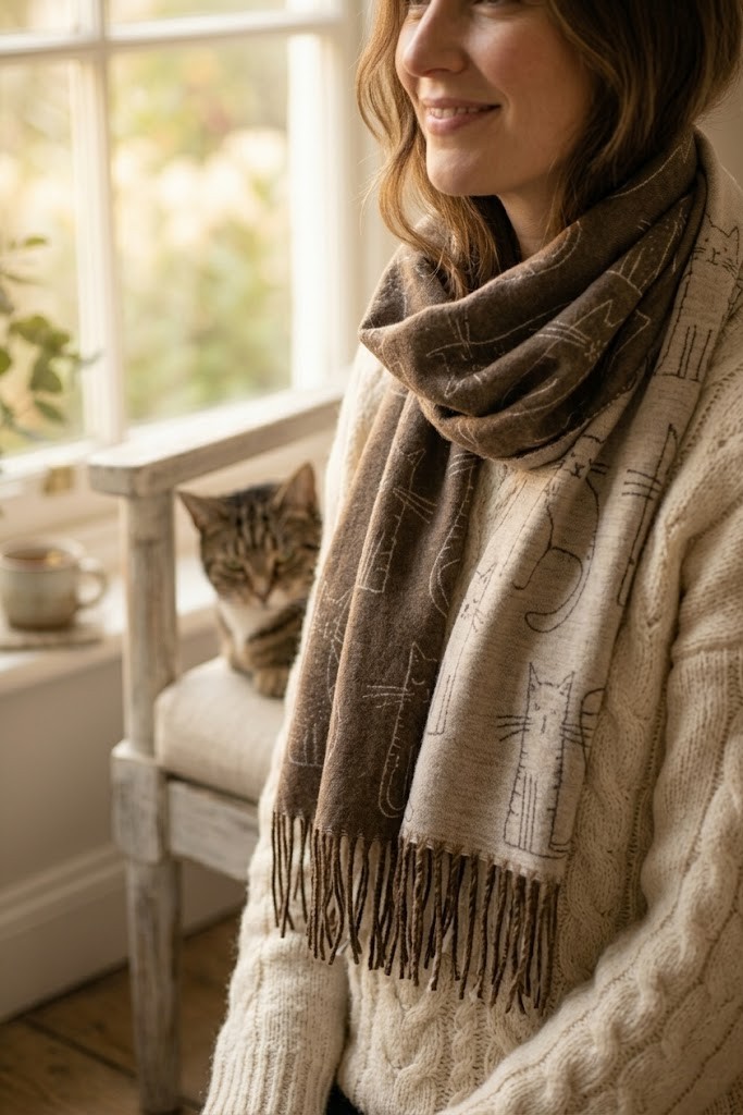 Szal, który łączy elegancję z codzienną wygodą – dla kocich mam, które wiedzą, że najlepsze dodatki powinny nie tylko grzać, ale i opowiadać o tym, co się kocha najbardziej.