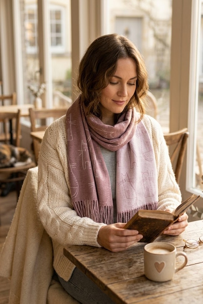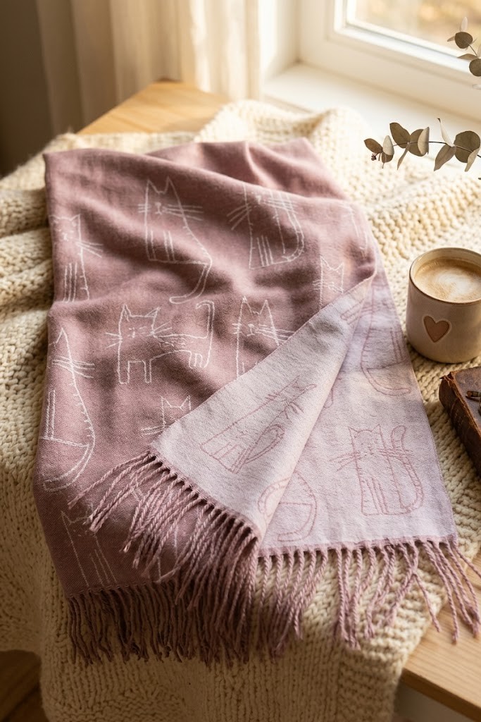 Szal, który łączy elegancję z codzienną wygodą – dla kocich mam, które wiedzą, że najlepsze dodatki powinny nie tylko grzać, ale i opowiadać o tym, co się kocha najbardziej.