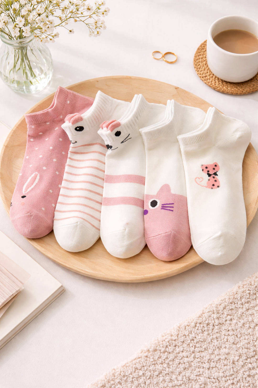 Jeśli uważasz, że dobry dzień zaczyna się od wygodnych skarpetek, a jeszcze lepszy – od skarpetek z kotem, ten zestaw został stworzony właśnie dla Ciebie. Urocze stopki w odcieniach bieli i różu ozdobione kocimi motywami dodają stylizacjom lekkości i odrobiny humoru, a przy tym pozostają subtelnym, modnym detalem.