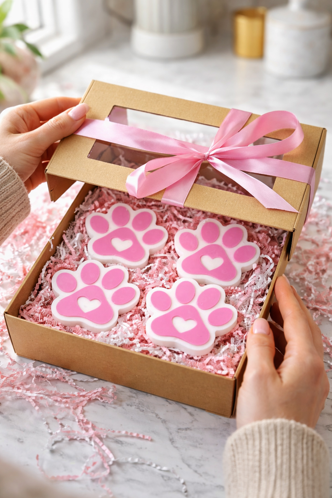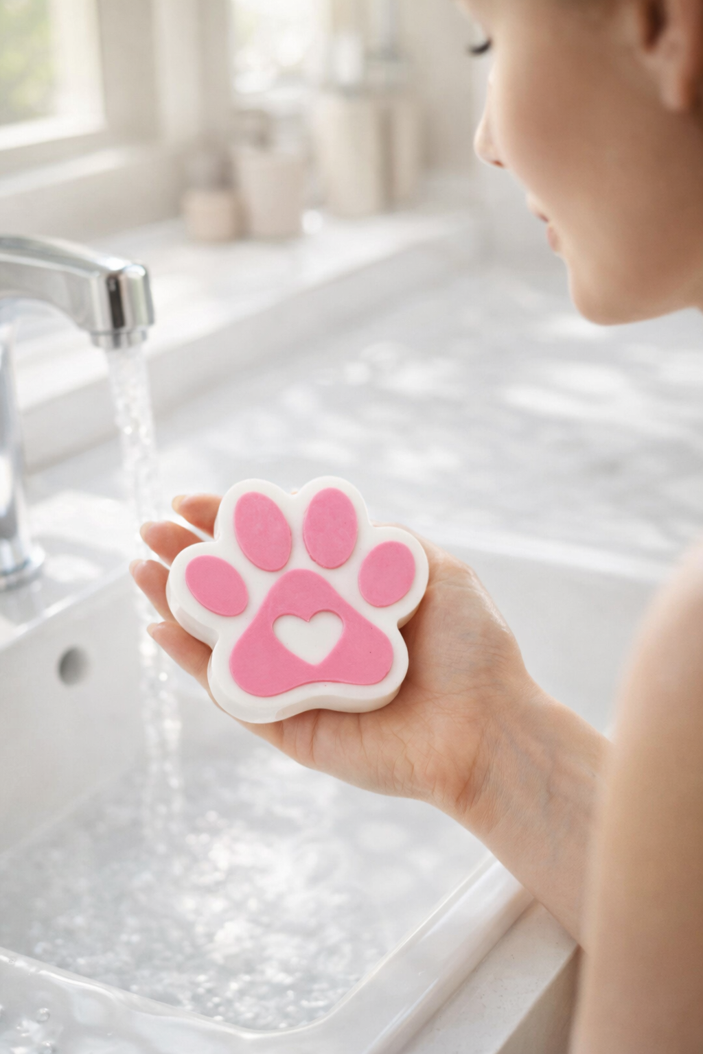 Nasze ręcznie tworzone mydło w kształcie kociej łapki z serduszkiem powstaje w pracowni w Zabrzu – z dbałością o każdy szczegół. Biała, delikatna baza kontrastuje z różowymi „fasolkami”, które wyglądają tak realistycznie, że aż chce się ich dotknąć.